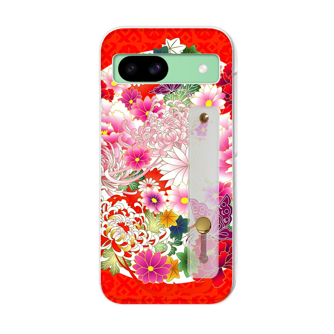 【送料無料】Pixel 8a 用 ハードケース スマホ ベルト付 スマホバンド 落下防止 シリコン スタンド機能付 リング スリム 背面 片手持ち カバー 携帯リング フィンガーリング 角度調整 007935 和風 和柄 花 赤 レッド