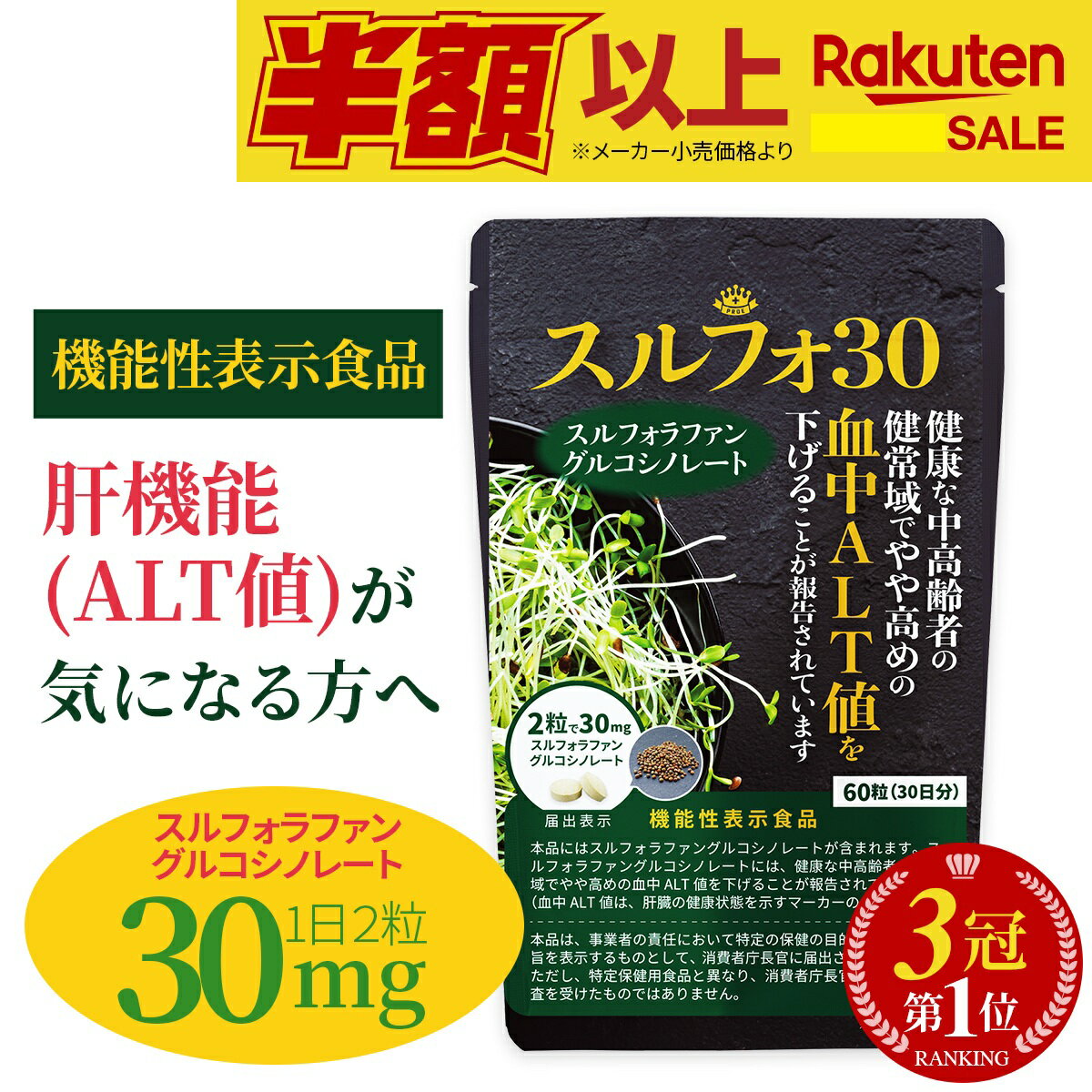 SALE セール【楽天1位】 スルフォラファン サプリ 肝臓 機能性表示食品 サプリメント 肝機能気になる方へ 肝臓ケア ALT ブロッコリー ブロッコリースプラウト スーパーフード ダイエット 健康 効果 野菜 市販 お試し オススメ 日本製 30日分 送料無料 (スルフォ30)