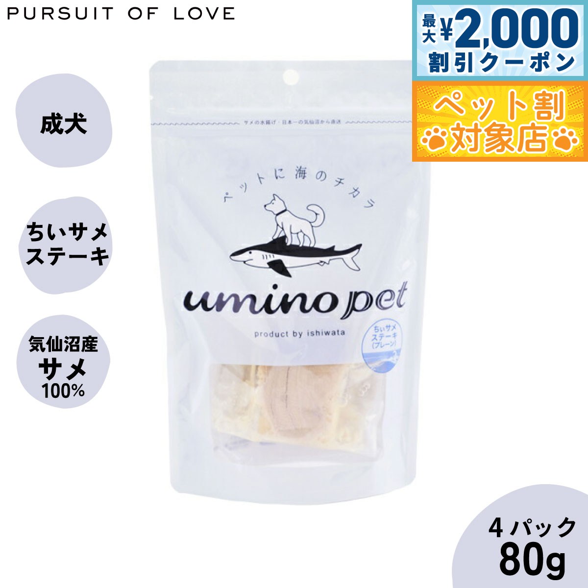 【最大2000円OFFクーポン!&店内ポイント最大62倍!スーパーSALE!】umino pet 愛犬用おやつ ちぃサメステーキ 4パック(80g) 国産 無添加 サメ