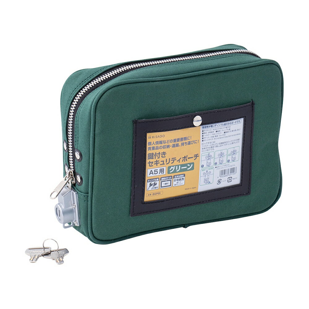 ヒサゴ 鍵付きセキュリティポーチ A5用 グリーン BGP05 鞄 かばん | 関連単語 ビジネスバッグ 自立 A4収納 出張 通勤用 革 ブリーフケース PC収納 ファスナー付き 書類かばん ショルダーバッグ トートバッグ 斜めがけ 軽い 布バッグ キャンバスバッグ ミニバッグ