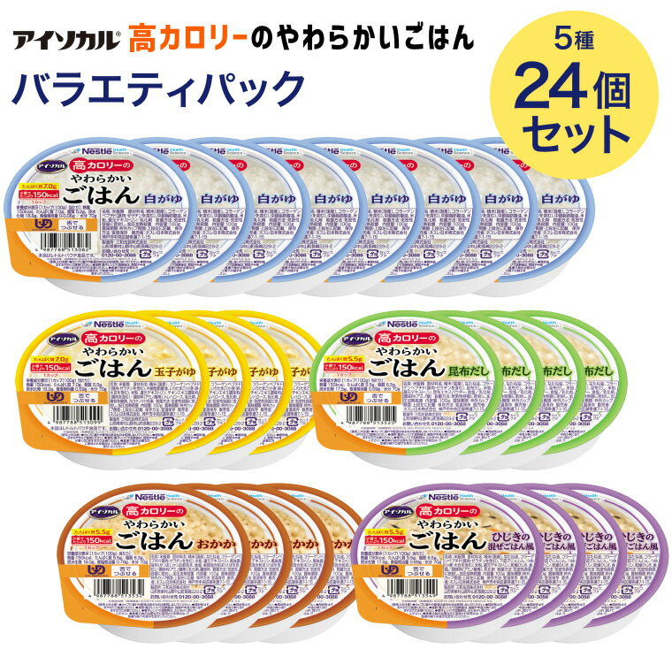 ご購入前にご確認ください日々のプレゼントや、父の日/母の日/敬老の日など各種イベント時のギフトや贈り物として、70代、80代の方中心にお喜び頂いております。 100gとコンパクトな食べきりサイズで、150kcalとたっぷり高カロリー。国産の精米を使用し、お米のおいしさを活かし、毎日食べたくなる味を目指しました。やわらかさにこだわったユニバーサルデザインフード企画製品。 ■アイソカル 高カロリーのやわらかいごはん バラエティパック 【内容量】:100g 【アソート内容】:白がゆ4個玉子がゆ2個昆布だし2個おかか2個ひじきの混ぜごはん風2個 【賞味期限】:白がゆ:製造日より12ヶ月玉子がゆ、昆布だし、ひじきの混ぜごはん風:製造日より9ヶ月おかか:製造日より8ヶ月賞味期限まで1.5か月以上残した状態で出荷いたします。 【アレルゲン情報】:原材料に含まれるアレルゲン(28品目中)白がゆ、昆布だし:豚肉、ゼラチン玉子がゆ:小麦、卵、大豆、鶏肉、豚肉、ゼラチンおかか:豚肉、ゼラチン、さばひじきの混ぜごはん風:豚肉、ゼラチン、小麦、大豆 【原材料名】:・白がゆ精米(国産)、なたね油、コラーゲンペプチド(豚肉・ゼラチンを含む)、還元デキストリン、米粉/トレハロース、乳化剤・玉子がゆ精米(国産)、なたね油、いりたまご(小麦・卵・大豆を含む)、コラーゲンペプチド(豚肉・ゼラチンを含む)、還元デキストリン、米粉、チキンエキス調味料(鶏肉を含む)/トレハロース、調味料(アミノ酸等)、乳化剤、増粘多糖類、カロチノイド色素・昆布だし精米(国産)、なたね油、コラーゲンペプチド(豚肉・ゼラチンを含む)、昆布だし、米粉、還元デキストリン、昆布エキスパウダー、食塩/トレハロース、乳化剤、調味料(アミノ酸)・おかか精米(国産)、なたね油、コラーゲンペプチド(豚肉・ゼラチンを含む)、米粉、還元デキストリン、風味調味料(かつお)、かつお節粉末、食塩、魚類混合粉末(さばを含む)/トレハロース、調味料(アミノ酸等)、乳化剤、酸味料・ひじきの混ぜごはん風精米(国産)、なたね油、コラーゲンペプチド(豚肉・ゼラチンを含む)、下茹でにんじん、つゆ(小麦・大豆を含む)、米粉、還元デキストリン、乾燥ひじき、食塩/トレハロース、調味料(アミノ酸等)、乳化剤 【栄養成分表示】:・白がゆ【栄養成分表示[1カップ(100g)当たり]】:熱量:150kcalたんぱく質:5.5g脂質:5.5g炭水化物:19.5g食塩相当量:0-0.06g/水分 70g・玉子がゆ【栄養成分表示[1カップ(100g)当たり]】:熱量:150kcalたんぱく質:5.5g脂質:6.2g炭水化物:18.0g食塩相当量:0.69g/水分 70g・昆布だし / ひじきの混ぜごはん風【栄養成分表示[1カップ(100g)当たり]】:熱量:150kcalたんぱく質:5.5g脂質:6.5g炭水化物:17.5g食塩相当量:0.69g/水分 70g・おかか【栄養成分表示[1カップ(100g)当たり]】:熱量:150kcalたんぱく質:5.5g脂質:6.3g炭水化物:18.0g食塩相当量:0.78g/水分 70g 【使用上の注意】:●常温で保管してください。●開封後はすみやかにご使用ください。●低温で保存すると、食感が硬くなることがあります。その場合には、温めてかき混ぜてからお召し上がりください。●プラスチックカップ入りです。カップに漏れや膨張のあるものは使用しないでください。●開封時に異様な変色、異臭や凝固のあるものは使用しないでください。●常温、もしくは湯煎・電子レンジで加熱してお召し上がりいただけます。電子レンジで加熱する時は、ふたを少し開けてください。電子レンジ加熱時間の目安(500W/600W):約20秒〜60秒※加熱時間の目安は、電子レンジの機種、ワット数等により異なる場合がありますので加減してください。・オート加熱不可・湯煎の場合、ふたを開けずにそのままお湯に入れて温めてください。●湯煎、電子レンジ加熱後は、容器や中身が熱くなりますのでご注意ください。●食事介助が必要な方に使用される場合は、介助者が嚥下の様子を見守ってください。●医師・栄養士等の指導にもとづいて使用されることをお勧めします。●低温で保存すると、食感が変化(硬化)したり、風味が劣化したり、離水(米等に含まれる水分が分離)することがあります。そのような場合は、少し温めてから、かき混ぜてお召し上がりください。 【販売者】:ネスレ日本株式会社ネスレ ヘルスサイエンス カンパニー東京都品川区東品川2-2-20
