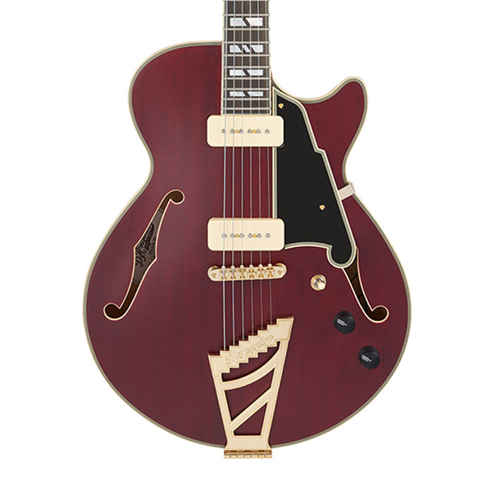 ※画像はサンプル画像になります。 Deluxe SS P-90は、オリジナルの15インチ(381mm) 幅、1.75インチ(44.45mm) 厚の小振りなシングル・カッタウェイ・シェイプにセンター・ブロック構造をもったセミホロー・ボディーのモデルです。 ディアンジェリコらしさを感じるオリジナル形状のピックガードは、fホールの一部を思わせるデザインで、5プライのブラックとなっています。 ボディー・トップ、ヘッドストックとネックにはバインディングが装飾され、マザー・オブ・パールの存在感のあるスプリット・ブロック・ポジションマーカーと組み合わせたデザインはシックでゴージャスな印象を与えます。 ボディーはトップ、サイド&バック共にマホガニーで、ネックはメイプルの間にウォールナットを挟んだ反りや捻じれに強い3ピース構造で25インチ(635mm) のスケールを採用し、エボニー・フィンガーボードを用いています。 ネックとボディーの接合はセット・ネック・ジョイントで、デュアル・アクションのトラスロッドを搭載し、ヘッド側で調整するようになっています。 特徴的なヘッドストック・デザインはディアンジェリコの伝統を継承しています。 トラスロッド・カバーは高級感のあるエボニー製で、1930年頃にニューヨークで流行したアール・デコ建築(エンパイア・ステート・ビルディングなど)が建ち並ぶニューヨークの摩天楼にインスパイアされたデザインです。 ピックアップはスタック・タイプのセイモア・ダンカンSTK P-90(クリーム・カラー)を2基搭載しています。 ハードウェアはゴールドで統一し、チューニングの安定を実現した グローバーのスーパー・ロトマティック・ロッキング・マシンヘッド、チューンOマティック&ステア・ステップ・テイルピースの仕様です。 頑丈な専用ハードケースが付属します。 SPEC ■Headstock Shape: Standard ■Headstock Logo Inlay: Mother of Pearl D'Angelico New York Logo ■Headstock Series Inlay (Front): Mother of Pearl Deluxe Shield Logo ■Headstock Serial Number (Back): Model Name, Serial Number ■Headstock Binding: 3-Ply ■Headstock Finish: Satin ■Headpin: Cupola ■Tuners: Grover® 509 Super Rotomatic, Locking ■Strings: .010-.046 ■Truss Rod Cover: Skyscraper, Ebony Wood ■Nut Width: 1 11/16" (42.86mm) ■Nut Material: Bone ■Fingerboard Material: Ebony ■Fingerboard Binding: 3-Ply ■Fretwire: Jescar 47/104 Nickel Silver ■Scale Length: 25" (635mm) ■Fingerboard Radius: 12" (304.8mm) ■Top Inlay: Mother of Pearl Split Block ■Fret Number: 22 ■Neck Material: 3 Piece: Maple / Walnut / Maple ■Neck Finish: Satin ■Neck Profile: C-Shape ■Joint Type: Set Neck ■Truss Rod: Dual Action ■Body Shape: Single Cutaway ■Body Style: Semi-Hollow (with Centerblock) ■Body Depth: 1.75" (44.45mm) ■Body Width: 15" (381mm) ■Body Color: Satin Trans Wine ■Body Finish: Satin ■Body Top Material: Laminated Mahogany ■Body Back Material: Laminated Mahogany ■Body Side Material: Laminated Mahogany ■Body Binding: 5-Ply ■Bridge: Gold Tune-O-Matic ■Tailpiece: Stairstep Tailpiece ■Pickguard: Solid Black Scalini (5-Ply) ■Pickup Selector: 3-Way Toggle ■Knobs: 2 Ebony ■Strap Buttons: Gold, Locking ■Electronics Overview: 2 P90s // 3-Way Toggle Switch // 1 Volume, 1 Tone ■Pickup (Neck): Seymour Duncan STK P-90 Neck (Cream) ■Pickup (Bridge): Seymour Duncan STK P-90 Bridge (Cream) ■Pots: 500k ■Output Jack: Standard Mono ■Hardware Color: Gold ■Case: Deluxe Hardshell
