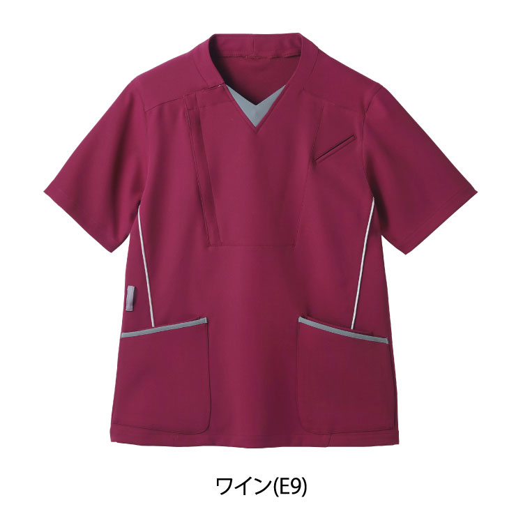 男女兼用スクラブ 着脱がラクなのにすっきり見えるデザインスクラブ。 かがんでもチラ見えしにくいVネックの配色がポイントです。 大きく開く肩のスナップボタンと胸下までのファスナーで着脱がスムーズ。 後衿付け部分にストラップがずれにくいタブ付き、左胸と両腰にポケット、 さらにウエストループが付いています。 腰ポケットはたっぷり収納で、小物を分別しやすい2重構造。 ネイビー・ワイン・ブルー・グリーンの4色展開です。 素材 二重織ストレッチツイル (ポリエステル100%) 制菌、制電、吸汗速乾性、ストレッチ性に優れ、透けにくくソフトな手触りの素材です。