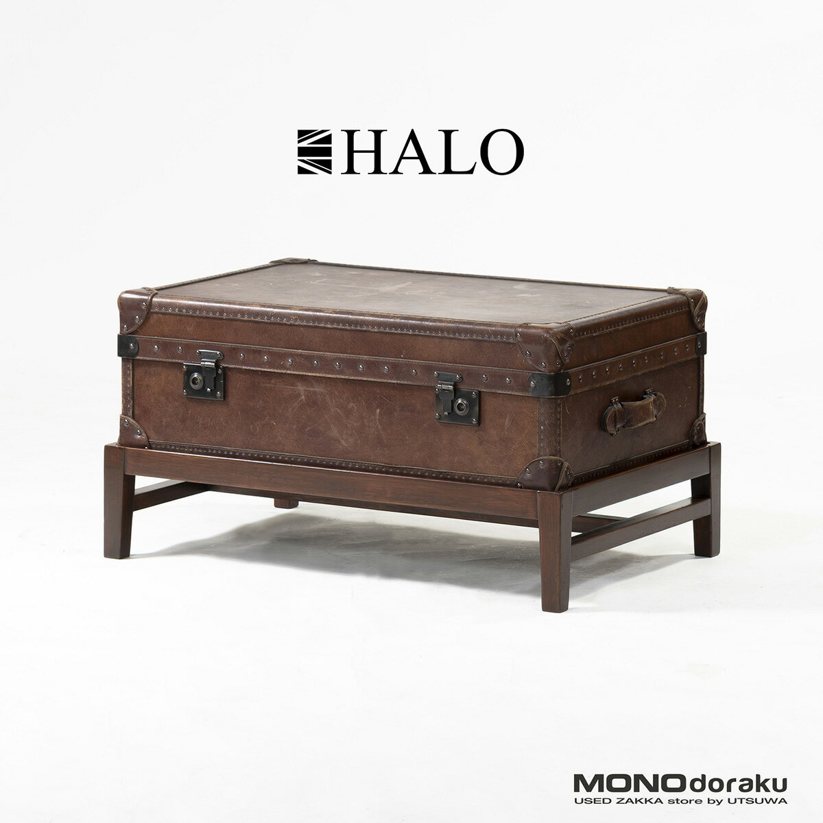 【中古】センターテーブル ハロ HALO WATSON MEDIUM TRUNK ワトソン ミディアム トランクテーブル レザー 専用スタンド付 ヴィンテージ風 アンティーク アスプルンド ASPLUND 収納テーブル リビングテーブル【中古センターテーブル】【中古家具】【USED】 空間に、冒険の余韻を。 【商品名】HALO WATSON MEDIUM TRUNK VINTAGE CIGAR センターテーブル スタンド付【サイズ】幅/92cm 奥行き/61cm 高さ/48cm 【コンディション】※トランク本体はクリーニング後蜜蝋ワックスでメンテナンス済み。※輪染みや擦れはあるものの製品仕様も相まって、より使い込まれたような風合いをお楽しみいただけます。※脚部は擦れや塗装剥げがあったため、クリーニング後、本体と使用感の差が出ない程度に着色とオイルメンテナンス済み。※全体的な使用感はあるものの、メンテナンスも施しており、製品仕様も相まってヴィンテージアイテムのような風合いをお楽しみいただけます。※商品は、写真のものが全てです。※画像は現物を撮影しておりますが、照度・モニター環境により実物と色味が異なる場合があります。※手作業による採寸のため、若干の誤差はご了承ください。〇沖縄配送不可。〇状態に関しましては、多少の見落としや表現出来ていない部分もあるかもしれません。〇あくまでも中古品のため新品同様をお求めの方、神経質な方はご購入をお控えください。〇気になる点やご質問等があれば、必ず購入する前にご質問よりお問い合わせください。【商品説明】アンティーク家具の販売とリノベーションを原点に、伝統的な意匠や製法から着想を得たリプロダクトを展開する英国家具ブランドHALO。厳選された素材、確かなクラフトマンシップにより生み出される家具は、アンティークの風格にモダンな解釈を重ねた独自の世界観が特徴です。家具の枠を超えたファッション性と存在感で、住空間のみならず多様なシーンを彩るアイテムが人気です。こちらはHALOを代表する人気シリーズWATSON MEDIUM TRUNK。「旅」というコンセプトをもとに、ヴィンテージトランクからインスピレーションを得て生み出されたセンターテーブルです。本革張りの重厚なボディに、鋲打ちや金具のディテールを施し、使い込まれたトランクのような存在感を表現。専用スタンドにより程よい高さが確保され、センターテーブルとしての実用性も兼ね備えています。内部は収納としても機能し、リビング周りで散らかりがちなリモコンやティッシュ箱なども隠して収納できます。リビングの主役としてはもちろん、ショップディスプレイやラウンジ空間にも映える一台。収納機能を備えながら、空間そのものに物語を与えてくれるHALOならではのプロダクトです。 5