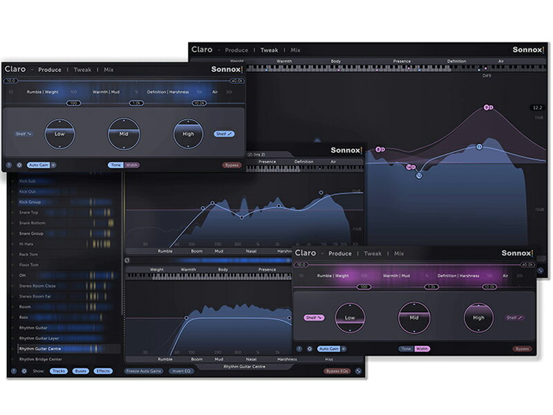 Claroは、作曲からミックスの最終段までの制作プロセスを支えるイコライザーです。 Claro・イコライザー Claroは、作曲からミックスの最終段までの制作プロセスを支えるイコライザーです。3つの明確なビューを通して、集中力を維持し、ワークフローを加速させます。PRODUCE Claroは、音楽の創造性を積極的に促進する、創造的で合理的なEQです。PRODUCEセクションでは大まかなEQの調整を行います。独自のオートゲインにより、各帯域の調整を行っても音量の変化は発生しません。TWEAK PRODUCEの結果をもとに、さらなる補正を行います。Sonnoxのトレードマークである透明感をさらに高める、最もクリーンでフレキシブルなEQ効果を得ることができます。MIX ミックスを理解して組み立てるために必要な情報はすべてここにあります。すべてのトラックがコンテクストで表示され、優先順位をつけたり、異なるトラック間の相互作用を調べたり、スペースを奪い合っているトラックの周波数の処理にすばやく対処することができます。まずは全体を整え、後から細部を調整 流れを止めずにEQをコントロール - EQカーブが正しいかどうかよりも、どこにエネルギーがあるのか、どのようなトーン特性を実現したいのかにまずは焦点を当てましょう。 ミッドサイドEQは、ステレオのシンセサウンドやループの調整に欠かせません。トーン・シェイピングと同様に、Widthモードに切り替えてサイドチャンネルのエネルギーがどこから来ているかを確認し、それを微調整することも可能です。実用的なオートゲイン 他のEQでおなじみのオートゲインではありません。Claroのオートゲインはユニークな方法で動作し、どのようにシェイプしても、シェイプされたトラックを同じラウドネスに保つことができます。 ブーストさせてもミックスのバランスが崩れたり、他のトラックと競合が発生することはありません。音を「彫刻」する フィルターのレゾナンスを調整したり、左右やミッド/サイドの幅のバランスを調整したり、箱鳴りや不快なピークの原因となる共鳴部分を減衰させたりするために、より細かい部分にまで踏み込む必要がある場合があります。 Claroのアダプティブ・スペクトラム・アナライザーは、チャンネル(左、右、中間、サイド、ステレオ)と選択中のバンドのQに沿って、必要な情報を表示します。もうブーストやスイープをする必要はありません。Claroは共振を識別し、減衰させたい量や量をコントロールすることができます。 マルチトラック・ワークスペース リード・エレメントを中心に細かい調整を重ねてミックスを洗練させていくスキルを身につけましょう。 プロジェクト全体の「Claroインスタンス」を見ることができます。トラック同士のエネルギーがどのように相互作用し、ある音が他の音を「マスク」して聞こえにくくしているかを確認できます。ドラッグ&ドロップで、トラックの組み合わせに応じたEQの調整が可能です。 各トラックがトップのEQスロットと相互に影響し合い、一緒に聴くとブーミーな音、濁った音、きつい音になる可能性があるエリアは黄色にマークされます。 *最新の動作環境をメーカーサイトにてご確認を頂ますようお願いいたします。 ※上記製品仕様は2022年10月時点のものです。 随時更新するよう努めてはおりますが、最新状況は常に変動するため合わせてメーカーでもご確認下さい。