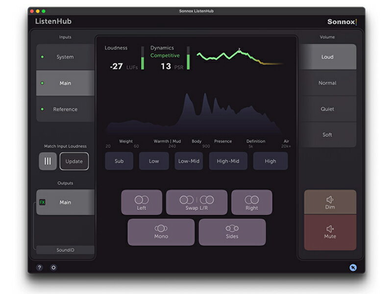 ListenHubは、重要なリファレンスとモニタリングのソリューションを指先で操作できるオーディオ・コントロール・ツールボックスです。 Listen Hub・オーディオコントロールツールボックス ベッドルームからプロフェッショナルまで、プロデューサーやエンジニアは、既存の楽曲を自分のミックスをより深く理解するためのリファレンスとして使用しています。 ListenHubは、重要なリファレンスとモニタリングのソリューションを指先で操作できるオーディオ・コントロール・ツールボックスです。あなたのミックスをお気に入りの作品に負けないクオリティに仕上げることができます。 段階的な音量調整により、素早く再現性のあるリスニングレベルを実現し、一貫したミキシング判断が可能です。ラウドネスとダイナミクスのシンプルな測定機能により、常に安定した状態を保つことができます。スペクトルメーターは周波数成分を表示し、リファレンストラックを反映させたバランスの良いミックスを実現します。 同じものを繰り返し聴いていくうちにリスニングの客観性が失われ、ある細部に固執して、他の細部が判断できなくなることがよくあります。枝葉に注目するあまり、音楽全体を大きな絵として捉えることができなくなってしまうのです。ListenHubは、必要な知覚のリセットと一貫性を与え、繰り返し聴いたときにも「新鮮な耳」で音を判断することができるようになります。 お気に入りの曲とミックスをA/B比較してみましょう。どこが優れていて、どこを修正すればいいのかが瞬時に分かります。 異なるステレオチャンネルをソロにして、モノラルとの互換性、ローエンドのフォーカス、ステレオフィールドを確認することが可能です。周波数帯域を分離して新鮮な視点を得たり、キックとベースの関係など、見落とされているディテールに注目することもできます。 ListenHubはMacから直接アクセスできるほか、タブレットやスマートフォン向けの無料のiOS/Androidアプリも用意されています。ListenHubは、ハードウェア・モニター・コントローラーの即時性、柔軟性、触感を、ソフトウェア・ルーティングの利便性と融合させました。ゼロレイテンシーのプラグインとして、またはシステム全体のアプリとして使用することができます。 オーディオメーターは一般的に分かりづらいものも威圧的なイメージを受けますが、ListenHubは簡単なメーターツールを備えており、音楽との調和を保つために最大限の効果を発揮します。 またリファレンストラックを探したり、購入したり、ダウンロードしたりするのに時間を費やす必要はありません。Spotify、Apple Music、YouTube、Tidal、またはご自身のローカルストレージからストリーミングすることができます。 AUプラグインホスティングを利用して、SonarworksやSteven Slateなどの強力なルームコレクションやシミュレーションソフトウェアを最大限に活用できます。ListenHubの出力にプラグインを適用すると、選択した設定が自動的に適用されます。 また、Sonarworksのプロファイルをスピーカーやヘッドホンごとに使い分けることも可能です(プロファイルを毎回読み込む必要はありません)。 *最新の動作環境をメーカーサイトにてご確認を頂ますようお願いいたします。 ※上記製品仕様は2022年10月時点のものです。 随時更新するよう努めてはおりますが、最新状況は常に変動するため合わせてメーカーでもご確認下さい。