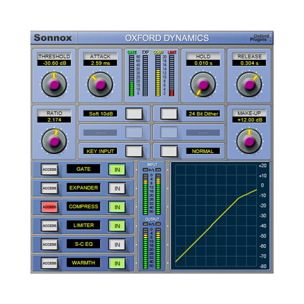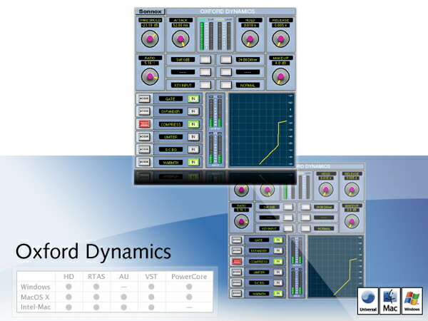 コンプレッサー、リミッター、エクスパンダー、ゲート、サイドチェインEQを統合した自然で存在感のあるダイナミクス系プラグイン。 Sonnox Oxford Dynamicsプラグインは、Sony Oxfordの業務用コンソールOXF-R3に搭載された柔軟度の高いダイナミクス系ユニットに基づいて作成されました。 Sonnox Oxfordでは、プロフェッショナルな現場におけるダイナミクス処理に関する徹底的なリサーチを行い、その結果に基づきコンプレッサー、リミッター、エクスパンダー、ゲート、サイドチェインEQを統合したユニットを開発しました。 各機能は、それぞれのOn/Offからパラメターの調整まで、完全に独立してコントロールすることができます。 また、サラウンド環境のマルチフォーマットに対応したバスコンプレッサー/リミッターも、別に用意されています。 コンプレッサーのニーはソフトなものからハードなものまで選択可能で、タイムコンスタントカーブもリニア/指数カーブから選べるので、微妙なレベルコントロール、マスタリング用途から、音楽的な音色変化を狙ったコンプ音まで対応します。 レベル検知およびサイドチェインをフィードバック音を使わず、完全に入力段階で行う「フィードフォワード」方式と、正確な対数サイドチェイン処理により、理想的なサウンドキャラクターと、正確なダイナミクス管理を実現しています。 透明で微妙なレベルの調整から、積極的な音作りまで。 この、洗練されたプロ仕様のプラグインを使えば、アナログ、デジタルを問わず、他のどんな製品でも実現不可能だったダイナミクス処理を体験していただけることでしょう。 ■レビュー 自然なマキシマイズ効果で存在感のある音を作り出す。 "さまざまなダイナミクス効果を生む万能エフェクト。 SONYが開発したOxfordコンソール内蔵のエフェクトと同じ、といううたい文句でEQプラグインがデビューしたのはまだ記憶に新しい。そのダイナミクス版だ。 EQ同様、淡いカラーを基調にしたデザインが上品だ。 他社が強烈なカラーを採用しているのと比べ地味ながらセンスが良く目に優しい。 ゲート、エキスパンダー、コンプレッサー、リミッター、サイドチェインEQとダイナミクス系エフェクトに求められる機能はすべて盛り込まれ、それらを単独あるいは組み合わせて使用できる。 各機能を呼び出すと必要なパラメーターがウィンドウ上に表示されるため、膨大なはずの設定がスッキリと分かりやすい。 パラメーターの設定値はプロ・ユースながら、あらゆるシチュエーションで使えるだろう。 また、アナログ・コンソールの操作感を再現するため、ボリューム・ポッドのデザインを採用しており、フィジカル・コントローラーなどでは一体感があるが、マウスでは必ずしも操作性が良いとは言えないかもしれない。 しかしながらスレッショルド・ポイントなどがグラフィカルに表示され、視認性という観点では、非常に分かりやすくなっている。 音質面では深いコンプレッション時にも変化が少なく、アナログでは実現し得ないクリーンなかかりだ。 一方で、温かみが魅力的なエフェクターでもある。"-伊藤圭一/Kim Studio ■主な特徴 * 完全に独立したパラメターを備えたコンプレッサー、リミッター、ゲート、エキスパンダーを装備したチャンネルダイナミクスプラグイン。 * 2バンドサイドチェインEQ付き(チャンネルダイナミクス)。 * チャンネルダイナミクスプラグインとは別に、サラウンドのマルチフォーマットに対応したバスコンプレッサー/リミッターを用意。 * リニア/指数カーブを選択可能なアタック/リリースカーブ。 * バスコンプレッサー/リミッターでは、サブチャンネルフィルターやゲイン検知コントロールを設定可能。 * 正確な対数サイドチェイン処理。 * ソフトからハードまでニーを選択可能。微妙なマスタリングから積極的なコンプ処理まで幅広く対応。 * 音の迫力、存在感、パンチを調整可能なInflatorゆずりの「ウォームス」機能付き。 * 超低ノイズ/歪み仕様 (-130dBr以下)。 * 全パラメターをオートメーション可能。
