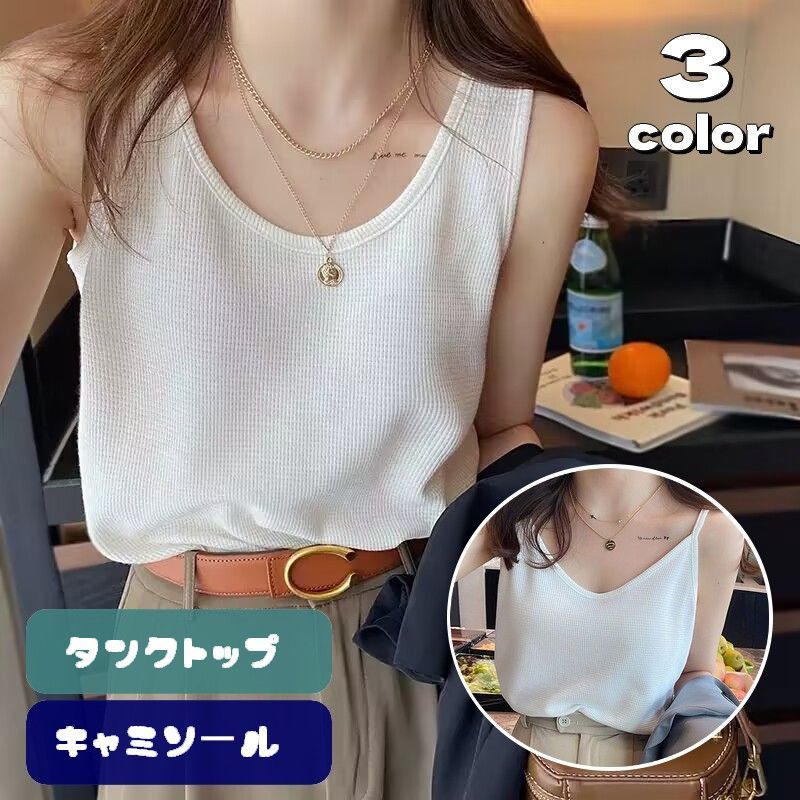 送料無料 タンクトップ キャミソール レディース トップス Uネック ワッフル生地 無地 ソリッドカラー シンプル プルオーバー 婦人服 女性用 着回し インナー カジュアル 普段着 部屋着 お出掛け
