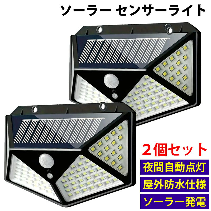 2個セット ソーラー センサー ライト 屋外 LED 人感 明るい 防水 玄関灯 ポーチライト ソーラーライト 広範囲照射 防犯 照明 ガレージ 100LED 高輝度 4面発光 3つ点灯モード 自動点灯 防水 人感センサー 駐車場 ガーデンライト 壁掛け 防雨 屋外照明 太陽光発電 送料無料