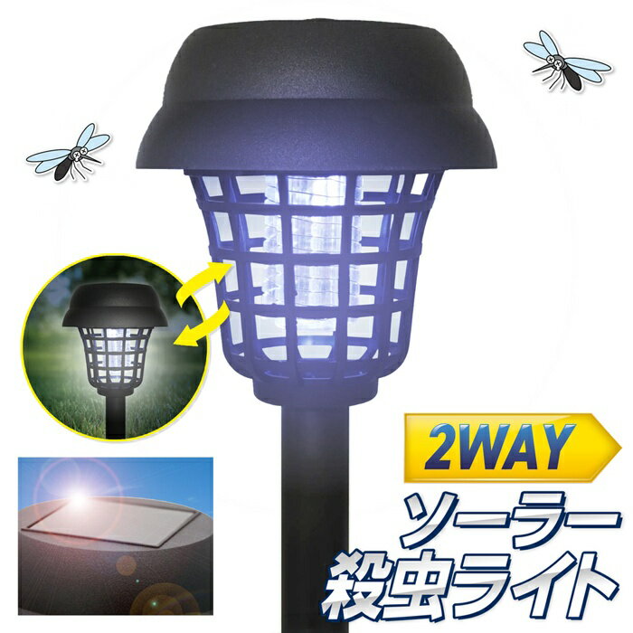 太陽光充電 防雨構造2WAYソーラー殺虫ライト 蚊や羽虫をブルーライトで誘い込む!明暗センサー搭載!自動点灯でラクラク ライトと虫対策の便利な2WAYライト。 本体上部にソーラーパネルを備えているから、電池不要で使用できます。 スイッチでLEDのガーデンライトと殺虫ライトを切り替え可能。 お庭や玄関先のアプローチライトにぴったりです。 ■ 2WAY仕様 照明モードと殺虫モードがスイッチひとつで切替! ガーデンライト&殺虫灯の1台2役。 【 殺虫灯モード 】 蚊や害虫をブルーライトで誘い込み撃退! 薬品を使わないので、 農作物があって薬品を撒きたくないという場所も使うことができます。 【 ガーデンライトモード 】 白色ライトが点灯。 庭や玄関先の明かり取りやアクセントに最適。 たくさん並べると雰囲気がグッとアップしますよ♪ ■ ソーラー充電 日中の太陽光で充電するので電気代0円! ■ 配線不要 地面に差すだけで、電源や配線は不要。 お好みの場所に手軽に設置できます。 ■ 暗くなると自動で点灯 主電源をONにしておけば夜間に自動点灯。 ■ 無臭&静音設計 気になる電撃音やニオイの心配ナシ。 ■ 薬剤不使用 家庭菜園の近くでも安心。 ■ 防雨構造 ■ 商品仕様 ■ 本体サイズ 組み立て時:約直径9×高さ35cm 本体質量 約100g パッケージサイズ 約W9.5×D9.5×H15.5cm 主材質 PP・ポリスチレン・シリコン 電源 ソーラー充電 充電時間 約8時間 連続点灯時間 約8時間(※LED・殺虫ライトともに) セット内容 本体×1個 ポール×1個 支柱×1本 ※ 本製品は防雨構造です。浸水の恐れがある場所には設置しないでください。 ※ 本製品は殺虫効果を100%保証したものではありません。虫の種類や設置環境によって誘引されない場合があります。 ※ 本製品は太陽光により自動で充電されます。充電される量は、日照時間や太陽光の強さ・使用頻度により異なります。そのため点灯時間も異なります。 ※ 電源スイッチがOFFの状態でも電気を帯びている可能性があります。 ※ 本製品を使用中に発生したケガや事故などの保証はいたしかねますので、あらかじめご了承ください。 ※ 充電時間・連続点灯可能時間はメーカー調べです。日照時間・太陽光の強さ・使用頻度により異なります。 ※ 充電池は繰り返し充電出来ますが、長期間充電がされないと充電池の性能が著しく落ちる場合がございます。 ・ 掲載画像はイメージであり、実際の製品とは多少異なる場合があります。 ・ パッケージや個装形態は入荷時期によって変更となる場合があります。 ・ 製品の仕様は品質の向上・改善のため、予告なく変更となる場合があります。▼3WAY設置タイプもあります▼