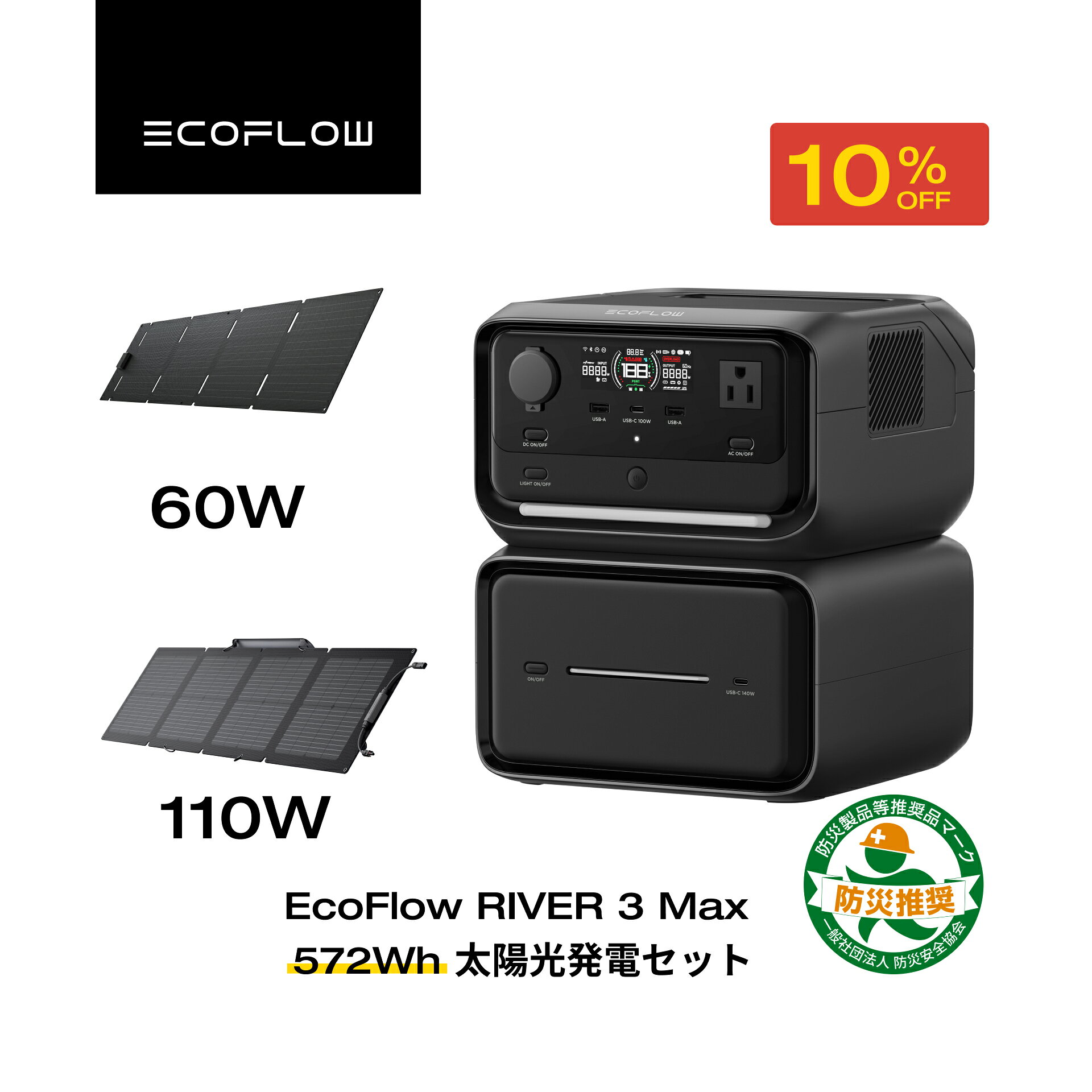 【クーポン利用で119,430円 12/1迄】EcoFlow ポータブル電源 ソーラーパネル セット RIVER 3 Max 572Wh RIVER 3 Max Plus 858Wh 6.4H/9.6H満充電 UPS機能 長寿命 2年保証 蓄電池 発電機 バッテリー 太陽光発電 節電 エコフロー