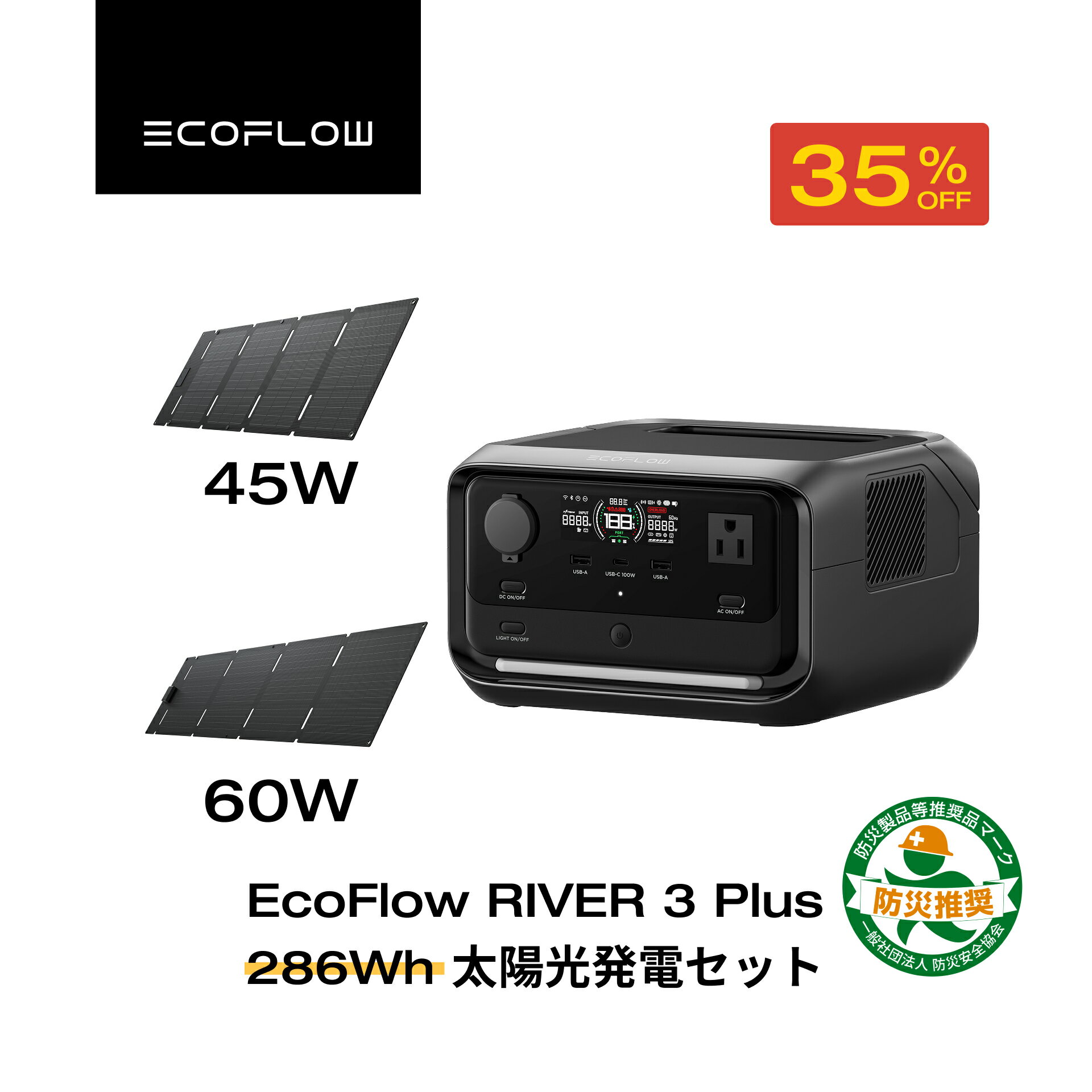 【プレゼント付き★クーポン利用で36,595円 12/1迄】EcoFlow ポータブル電源 ソーラーパネル セット RIVER 3 Plus 286Wh+45W/60Wソーラーパネル(Type-C) 7.3H/5.5H満充電 UPS機能 長寿命 25%変換効率 5年保証 蓄電池 発電機 バッテリー 太陽光発電 節電 エコフロー
