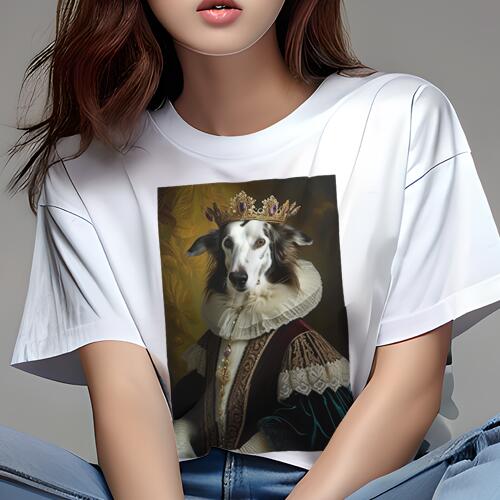 ボルゾイ Tシャツ レディース 犬ファン 半袖 春夏 犬柄 プリント カジュアル かわいい 人間用 個性派 ここだけのデザイン 面白 王冠 ボルゾイ ローブ 肖像画 ルネサンス