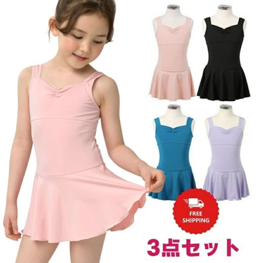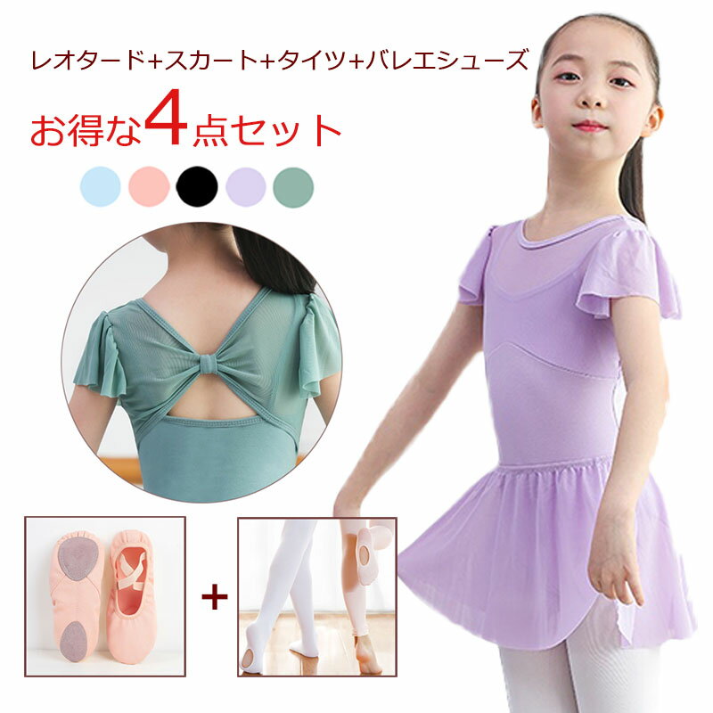 バレエ レオタード 子供 キッズ 子供レオタード 4点セット 「 レオタード + スカート +タイツ+バレエシューズ 」 ジュニア 人気 シンプル レッスン着 バレエセット バレエ用品 黒 ブラック/ピンク/パープル/ブルー 100cm/110cm/120cm/130cm/140cm/150cm/160cm