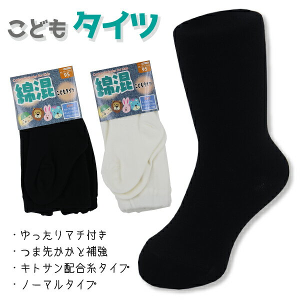 こどもタイツ 無地 子供 キッズ 綿混 タイツ 足付き 白 黒 ゆったりマチつき つま先かかと補強 2色 5サイズ 入園 入学 通園 通学【送料無料(税込1000円のお買上げが条件)】