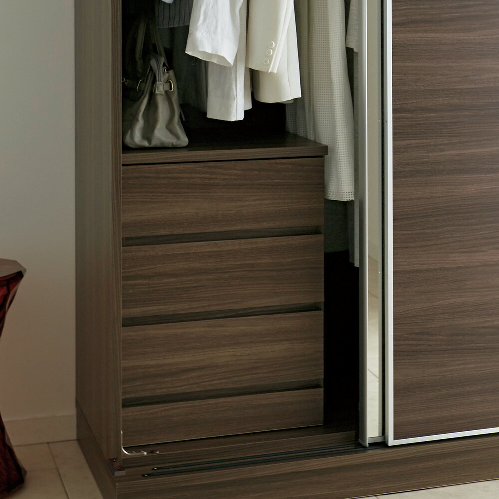 ミラススライドワードシリーズの専用オプション・木製インナーチェスト。大型の引き戸収納の中に収めて、引き出し収納としてより整理整頓しやすく。もちろん単品でもお使いいただけるので、お部屋に出して使用するなど模様替えの際も安心です。Milath/ミラス スライドワードローブ専用インナーチェストです■幅45cmタイプは幅120.5cmタイプ・幅140.5cmタイプ、幅160.5cmタイプのワードローブの左側に設置できます。■幅65cmタイプは幅160.5cmタイプのワードローブの左側に設置できます。■ワードローブ内に設置するインナーチェストですが、一般にチェストと同じ設計です。■外に出して普通のチェストとしても使用できるので、模様替えの際にも安心です。ページ下部に画像の説明がございます。一部別売りの商品もございますので、説明文ご確認のうえご注文ください。>画像の説明はこちら<仕様・サイズ[サイズ]【幅45cm】幅45cm奥行44.5cm高さ60cm【幅65cm】幅65cm奥行44.5cm高さ60cm[すべてのサイズに共通]■色:(ア)ホワイト (イ)ダークブラウン (ウ)ナチュラルウッド■前面…(ア)化粧合板(ピアフォルテ)(イ)(ウ)化粧合板(オレフィンシート)、天板・側面…化粧合板■日本製■幅45cm引出し[有効内寸]:幅約35.5cm 奥行約38cm 高さ約9.5cm■幅60cm引出し[有効内寸]:幅約55.5cm 奥行約38cm 高さ約9.5cm【送料マーク:B】 この商品の配送料は2500円(税込)です。※沖縄県へのお届けは上記に地域特別配送料2200円(税込)が追加されます。 画像の説明ダークブラウン・幅45cmタイプ[コーディネート例]チェスト幅45cmタイプ(ダークブラウン)+ミラーワードローブ幅120.5cmタイプダークブラウン・幅45cmタイプホワイト・幅65cmタイプ[コーディネート例]チェスト幅45cmタイプ(ダークブラウン)+ミラーワードローブ幅120.5cmタイプ[コーディネート例]チェスト幅65cmタイプ(ホワイト)+ガラスワードローブ幅160.5cmタイプ単品で外に出して使用も出来るので、模様替えなどでも安心です。出っ張った取っ手などが無いデザインで、ワードローブの中に入れても邪魔にならないシンプルデザイン。隠れる側面にも柄の美しい表面材を使用し、贅沢に仕上げました。背面背面引出は全段レール付きレール付きの引き出しで滑らかに開閉します。引き出し内部は白い化粧仕上げ。収納物に配慮し清潔感を意識して設計しました。引き出し下部に手掛けを設け、シンプルなデザインながら開けやすく。引き出しは簡単に取り外しが可能です。引き出しの側面迄白い表面材を使用し、美しく仕上げました。