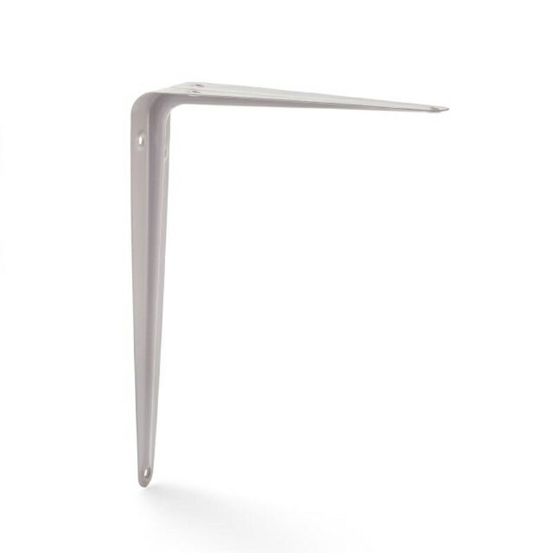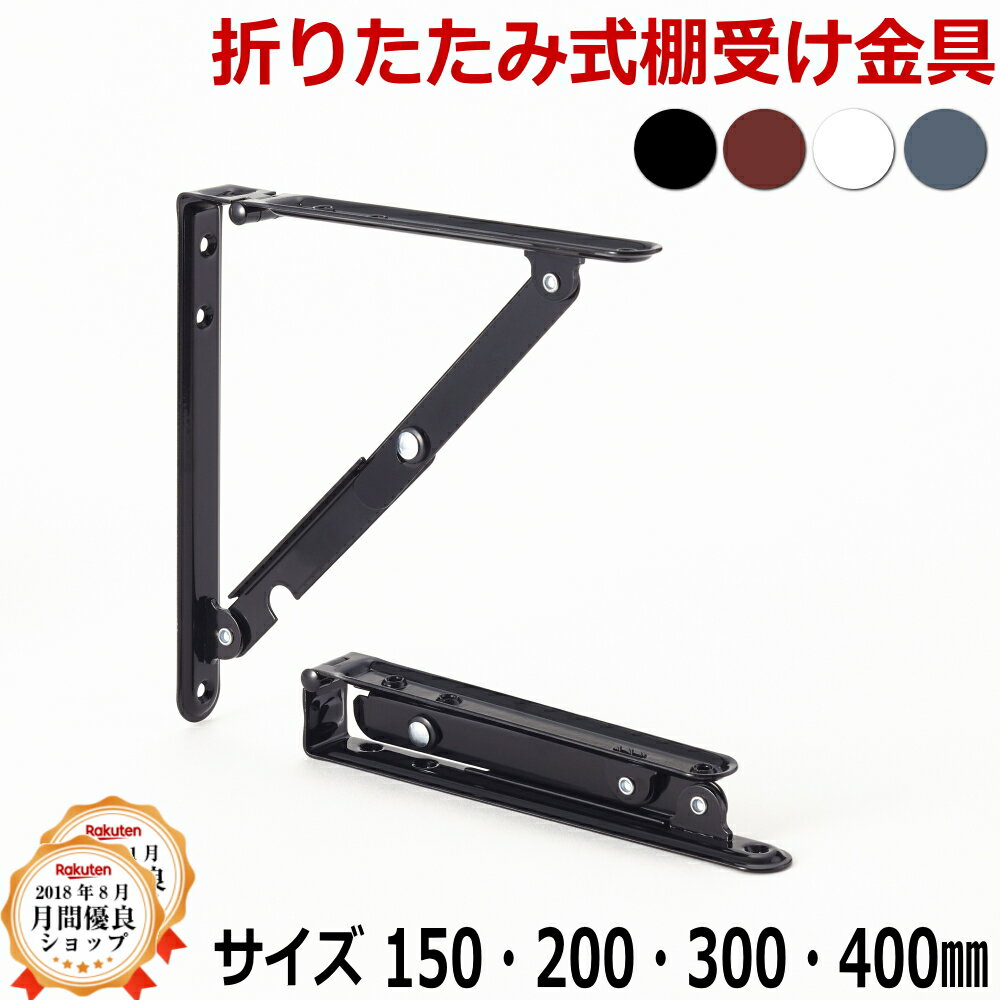 商品サイズ150ミリ:幅 2.1cm × 奥行 15cm × 高さ 15cm 200ミリ:幅 2.5cm × 奥行 20.4cm × 高さ 20.4cm 300ミリ:幅 2.8cm × 奥行 30.5cm × 高さ 30.5cm 400ミリ:幅 2.8cm × 奥行 40.6cm × 高さ 40.6cmカラー白、黒、茶、グレー材質鋼板重量150ミリ:0.25kg 200ミリ:0.45kg 300ミリ:0.83kg 400ミリ:1.13kg耐荷重40kg ※耐荷重は2本当たりの数値です。また、壁面への取付方法、取付ピッチによっても変わってくる事がありますので参考値です。セット内容[150ミリ]本体1セット(2本)、丸皿木ネジ(ユニクロ)M3.8Xl6=4本、M3.8X20=6本 [200ミリ] [300ミリ] [ 400ミリ]本体1セット(2本)、丸皿木ネジ(ユニクロ) M3.8Xl6=6本、M3.8X20=6本推奨棚板厚さ1.8cm以上注意事項この表示を無視して誤った取り扱いをすると、使用者が障害を負う可能性、または物的損害が発生する可能性があります。 ●制限荷重を守ってご使用ください。 ●ベニヤ板や石膏ボード等、木ネジ取付け強度が低い壁材では使用できません。 ●壁材・棚材・取り付け方法によっては、耐荷重以下の荷重でも取り付け外れ等、破損の恐れがあります。取り付け場所や方法等(木ネジ取り付け強度等)には充分ご注意ください。 ●急激に荷重の大きい物を乗せたり、勢をつけて乗せたりした場合、耐荷重以下でも破損等の恐れがあります。積載時には充分ご注意ください。 ●棚、ハンガー以外の目的(腰掛けや踏み台といった用途)にはご使用にならないでください。 ●先端部・可動部では指詰めや外傷の恐れがあります。取り付け時、開閉時には充分ご注意ください。 ●積載時は万一の落下や破損に備え、周囲を確認した上で安全を確保して頂きますようお願いします。 ●時計・ガラス製品などの貴重品や、落下による破損、または人体等に障害を与える危険性のあるものは乗せないでください。→ラブリコ木材セットの一覧はコチラ 折りたたみ式棚受け金具例えば、キッチンのカウンターやクローゼットの中の作業台、折りたたみテーブルなど 使わないときは、折りたたむ事ができるのでスペースを有効活用できます!使用方法[たたむ時]棚板を少し持ち上げて、ステーを押してたたむ [開く時]棚板を90°以上持ち上げる ※※※注意※※※ 開く時、ストッパーが完全に効いている事をご確認の上ご使用下さい使用例カラーは4色黒、白、グレー、茶の4色です ※写真はサイズ200ミリですサイズ詳細150ミリ:幅 2.1cm × 奥行 15cm × 高さ 15cm 200ミリ:幅 2.5cm × 奥行 20.4cm × 高さ 20.4cm 300ミリ:幅 2.8cm × 奥行 30.5cm × 高さ 30.5cm 400ミリ:幅 2.8cm × 奥行 40.6cm × 高さ 40.6cm〈 棚受け金具の取付方法 〉 1. 取付位置を決め、マーキングする。 金具の取付位置を決めます。棚受け金具の長い方が脚や壁側にくるようにしてマーキングしてください。垂直位置にも線を引いてマーキングします。 ※この時水平・垂直になるよう注意してください。 2. 金具を壁面に取り付ける。 金具を開いた後、印をつけたところに金具をあてながら、付属ネジの長い方を使ってネジ留めしてください。 3. 棚板を金具に取り付ける。 棚板をスムーズに上げ下げ出来るように壁から5mmくらいの間隔をあけて短い方のビスを使って棚板を取り付けてください。(5mmの間隔を測るために、台紙に目印を用意しています。)もう一方の金具も同様に取り付けます。 関連商品はこちら