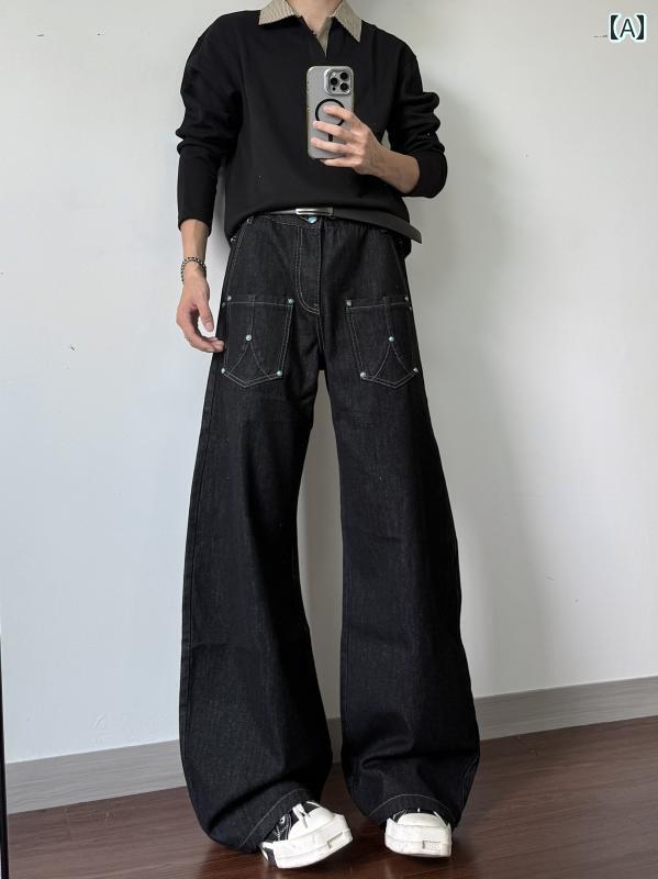 メンズ ファッション 春夏 秋冬 かっこいい オシャレ モテ 男性用 紳士服 服 韓国 シンプル 大人 アメリカン ターコイズ スタッズ ブラック ロー デニム カーブド パンツ クリーン フィット ストレート レッグ フレア トラウザー ズ