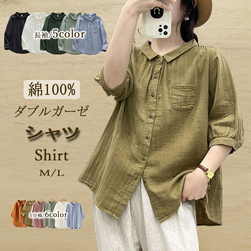 【在庫処分】長袖シャツ シャツ チュニック 綿シャツ レディース 半袖 ブラウス シャツブラウス 長袖 白シャツ ゆったり ガーゼシャツ 秋 半袖シャツ 無地 折襟 大きいサイズ コットン ダブルガーゼ ギャザー入り 通気性 柔らかい 秋物 通勤シャツ リラックス カジュアル 春