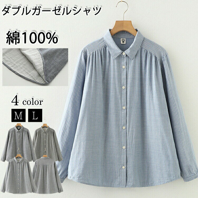 【100枚!5%COUPON+P5倍→実質3141円 11/17まで】シャツ ブラウス レディース ゆったり ガーゼシャツ ガーゼ ダブルガーゼ ギャザー チェック 無地 ストライプ柄 羽織 通勤 春秋 長袖 綿100% シャツブラウス
