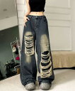 ダメージバギーデニムパンツヴィンテージ風 後ろゴムジー レディース 韓国風ジーパン ゆるレトロデニムワイドパンツ カジュアル