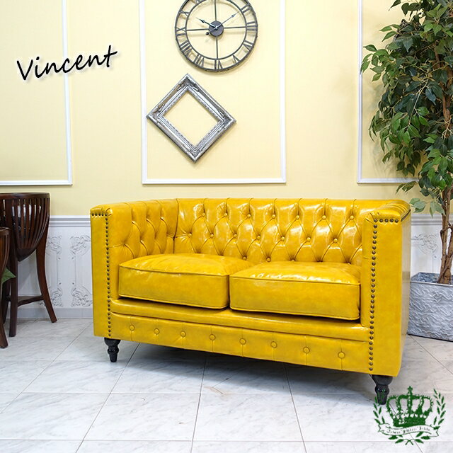 輸入家具 ソファー 2人掛け チェスターフィールド ソファ ヴィンセント チェスター ソファー アンティーク ダブルソファ 二人掛け イギリス デザイナーズ レトロ ヴィンテージ コンパクト チェスターフィールドソファ フェイクレザー PU 合皮 マスタードイエロー VM2P69K