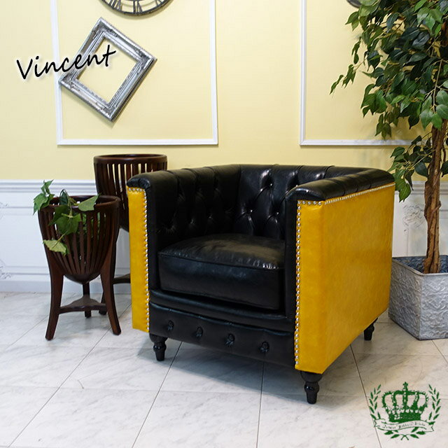 輸入家具 ソファ 一人掛け おしゃれ チェスターフィールド ソファ ヴィンセント チェスター ソファー アンティーク シングルソファ 1人掛け イギリス 英国 デザイナーズ ビンテージ チェスターフィールドソファ フェイクレザー PU ブラックアンドイエロー 黒 黄 vm1p51p69k
