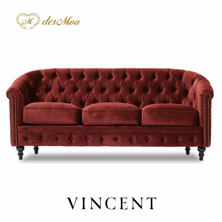VINCENT ヴィンセントシリーズ ラウンジソファ 3人掛けソファ 3人用 トリプル コンパクト 英国アンティーク調 レトロ クラシカル ヴィンテージ調 おしゃれ かっこいい 店舗什器 応接室 レストラン ホテル サロン ラウンジ 木製 輸入家具 布地 赤 レッドベルベット VL3F280K