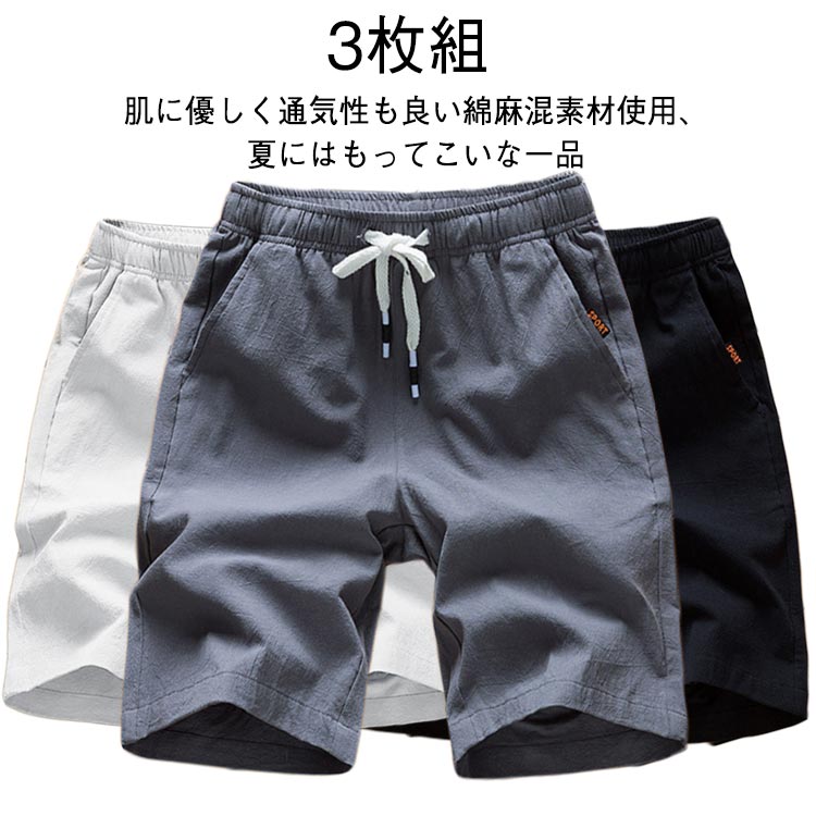 3枚セット ハーフパンツ メンズ 接触冷感 綿麻 ショートパンツ ひんやり 夏用 涼しい 吸汗 速乾 無地 ポケット付き 半ズボン 短パン 薄手 スリム ひざ上 膝上 五分丈 チノパン 夏 ショーパン ウエストゴム 大きいサイズ 夏服