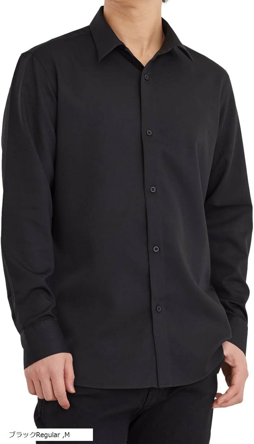 ラッキーチャーム シャツ メンズ 長袖 レギュラーシャツ カジュアル ストレッチ メンズシャツ 無地 スリムフィット (ブラックRegular, M)