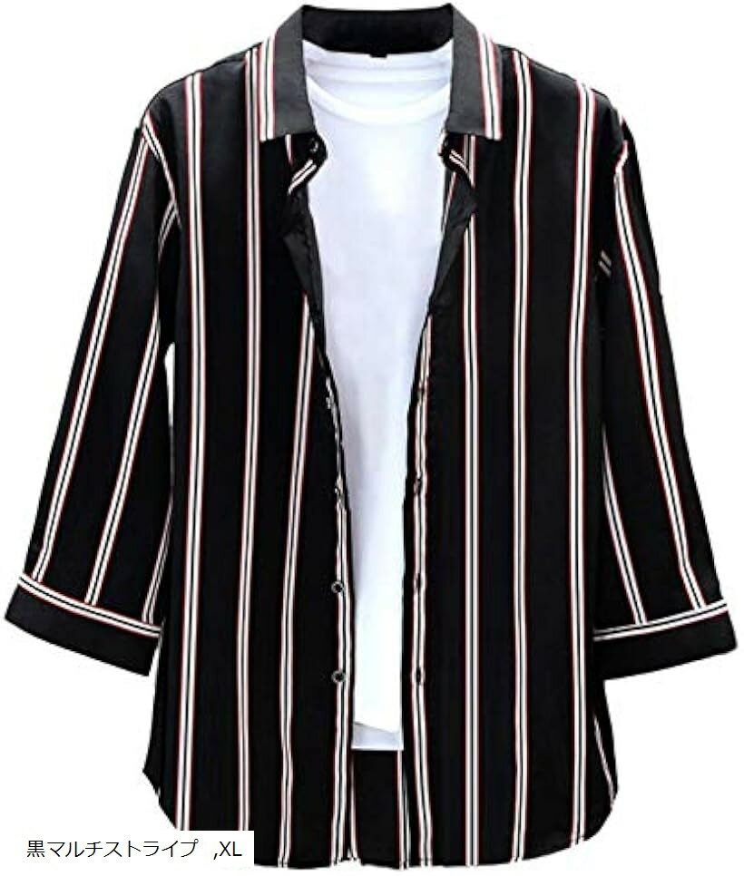 ラッキーチャーム XXL 黒マルチストライプ メンズ 長袖 ブラック デザイン 柄 細身 カジュアル 七分袖 大きいサイズ ポリエステル スリム 大人 七分丈シャツ カジュアルシャツ (黒マルチストライプ, XXL)