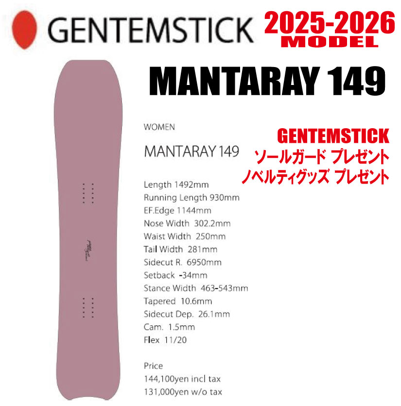 ★25-26モデル★GENTEMSTICK(ゲンテンスティック)MANTARAY 149 サイズ:149 【エッジカバー・チューンナップ・ショートビス・オリジナルグッズ プレゼント】【送料無料】(※北海道・沖縄/離島は送料別)