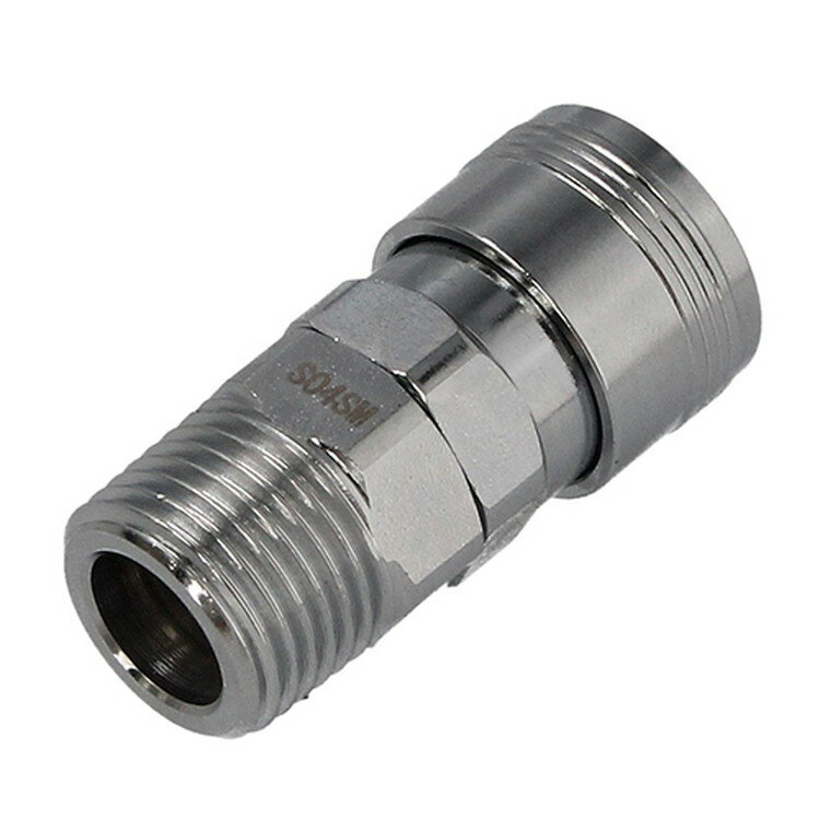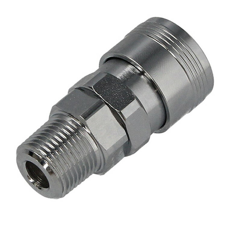 【特徴】エアホースなどの配管やエアー工具への接続、離脱が簡単操作で確実に行えます。 【用途】エアー工具、エアーホース等との脱着。 【機能】スリーブを引き下げて、プラグを押し込むだけで接続できます。 配管や工具との離脱はスリーブを引き下げるだけの簡単操作です。 スリーブ先端部をぶつけたり、不意に接触しても外れにくいツータッチ操作で、単純な構造ですが故障も少ないです。 丈夫で耐久性に優れた鋼鉄製です。 1/2管用テーパーオネジ取り付け用です。 【仕様】●最高使用圧力:1.5MPa。 ●耐圧力:2.0MPa。 ●シール材質:ニトリルゴム。 ●使用温度範囲:−20〜80度。 ●ネジ:1/2管用テーパーメネジRc1/2(PT1/2)。 ●適用流体:空気。 ●質量:約109g。 【材質】●鋼鉄・ニトリルゴム。