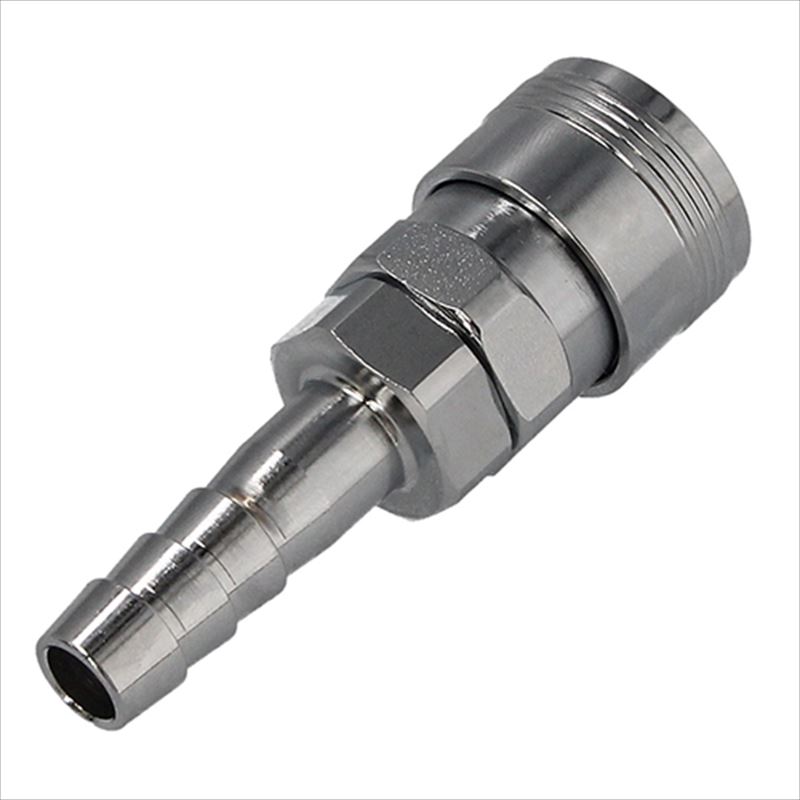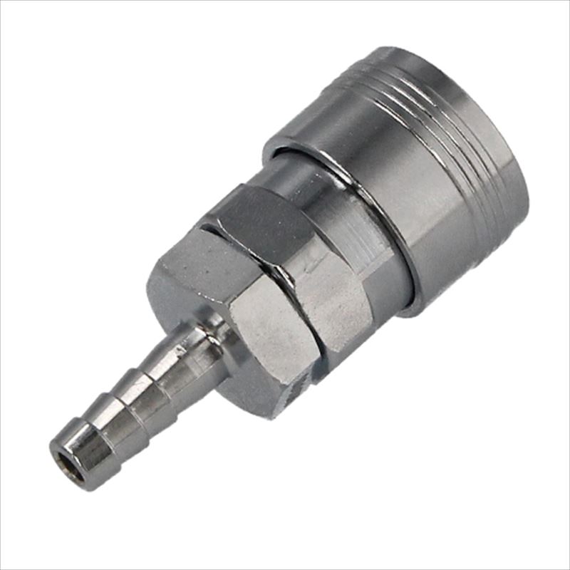 エアホースなどの配管やエアー工具への接続、離脱が簡単操作で確実に行えます。エアー工具、エアーホース等との脱着スリーブを引き下げて、プラグを押し込むだけで接続できます。配管や工具との離脱はスリーブを引き下げるだけの簡単操作です。スリーブ先端部をぶつけたり、不意に接触しても外れにくいツータッチ操作で、単純な構造ですが故障も少ないです。丈夫で耐久性に優れた鋼鉄製です。内径8.5×外径12.5mmウレタンホース取り付け用です。最高使用圧力:1.5MPa耐圧力:2.0MPaシール材質:ニトリルゴム使用温度範囲:-20~80度ナット部:内径8.5×外径12.5mm対応適用流体:空気質量:約99g鋼鉄・ニトリルゴム