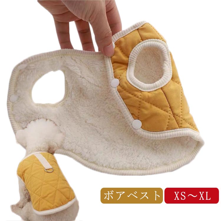 裏ボアで暖かい小型犬用のベスト。秋冬のお出かけやお散歩の防寒対策に◎スナップボタンで脱着カンタ♪背中側にはリングが付いておりお手持ちのリードとつなげれるのでハーネスが代わりとして使える。 サイズXS S M L XLサイズについての説明XS:胸囲30cm,背丈20cm; S:胸囲35cm,背丈25cm; M:胸囲40cm,背丈30cm; L:胸囲45cm,背丈35cm; XL:胸囲50cm,背丈40cm; 2XL:胸囲55cm,背丈45cm素材コットン、ポリエステル色イエロー備考 ●サイズ詳細等の測り方はスタッフ間で統一、徹底はしておりますが、実寸は商品によって若干の誤差(1cm〜3cm )がある場合がございますので、予めご了承ください。 ●商品の色は、撮影時の光や、お客様のモニターの色具合などにより、実際の商品と異なる場合がございます。あらかじめ、ご了承ください。●製品によっては、生地の特性上、洗濯時に縮む場合がございますので洗濯時はご注意下さいませ。▼色味の強い製品によっては他の衣類などに色移りする場合もございますので、速やかに(脱水、乾燥等)するようにお願いいたします。 ▼生地によっては摩擦や汗、雨などで濡れた時は、他の製品に移染する恐れがございますので、着用の際はご注意下さい。▼生地の特性上、やや匂いが強く感じられるものもございます。数日のご使用や陰干しなどで気になる匂いはほとんど感じられなくなります。