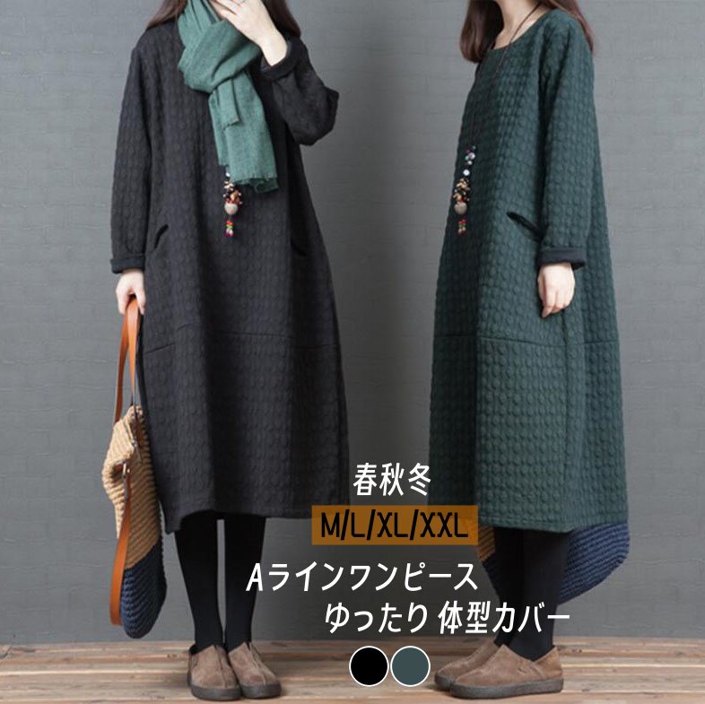 キルティング 綿混ワンピース レディース 30代 40代 50代 秋冬新作 ロングワンピース チュニック 長袖 クルーネック フレアワンピース ミモレ丈 体型カバー ゆったり 大きいサイズ カジュアル 通勤 デイリー 無地 着痩せ 暖かい 防寒 おしゃれ