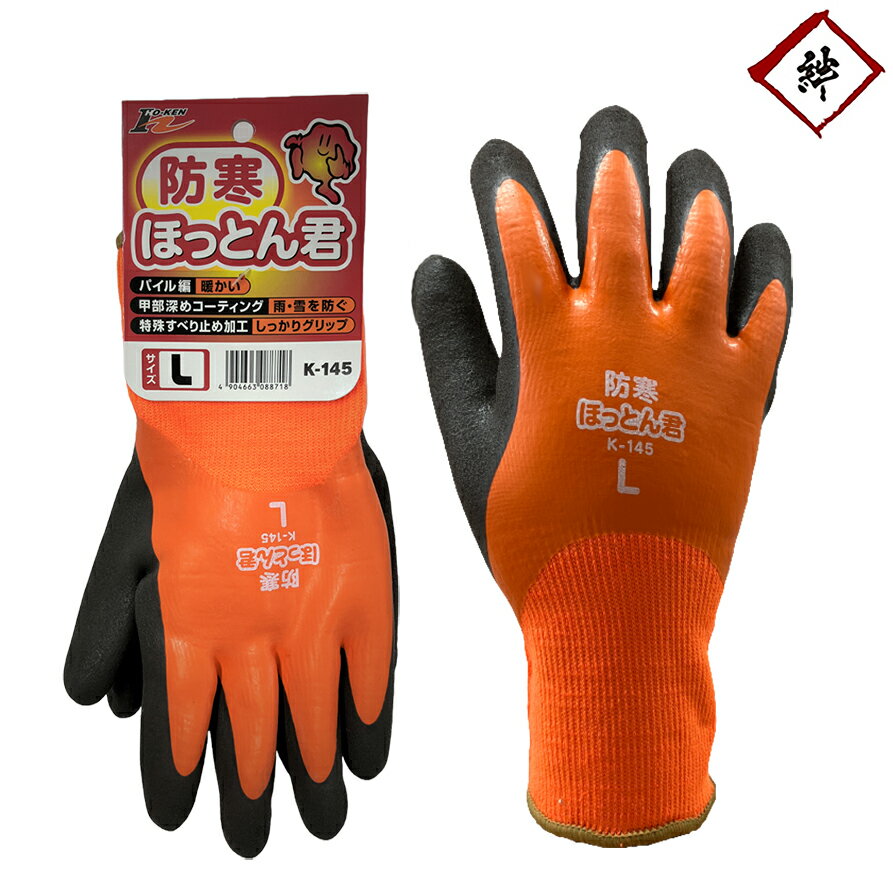 防寒ほっとん君 手袋 防寒 天然ゴム パイル編み 中部物産貿易株式会社 秋 冬 すべり止め 雪かき 雪おろし 冷凍庫内作業 オレンジ ブラック アクリル 冬作業 暖かい K-145 作業用 ホーケン ゴム手袋 コーティング