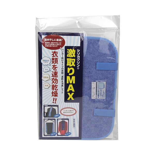 【商品説明】【用途】衣類の室内干しやクローゼット内の吸湿マット。【機能・特徴】高機能のシリカゲルを表面積を最大限に広げた特許製法の素材で、綿等であれば約1時間弱で乾燥し、あらゆるニオイも短時間で除去します。天日干し等で乾燥をさせることで機能が再生し、繰り返し使用可能、目で見てわかるセンサーも付属しており、吸湿具合も確認できます。本体を180度ひっくり返して、ハンガーの下部にとりつけることにより、ズボンやタオルの乾燥と消臭もできます。本体1枚で最大約90ml吸湿することができます。【仕様】●サイズ:約550×370×8mm。●色:ブルー。【材質】●本体:ポリエステル・シリカゲル。【注意事項ほか】あくまで激取りMAXは乾燥を補助するための商品です。使用いただくことで乾燥を早めることができます。本品は食べ物ではありません。お子様のいたずらにご注意ください。電子レンジは絶対に使用しないでください。シリカゲルの入ったシートは破らず、使用後は燃えないゴミとしてお捨てください。ワークサポート サポート用品 消臭 除湿グッズ4562265321154
