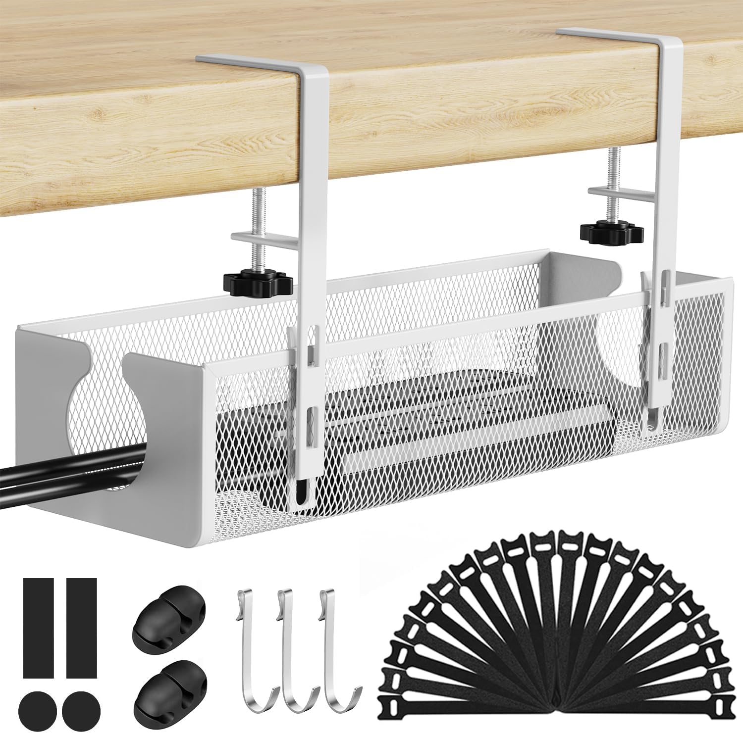 1【ロック式・使用便利】2024年の新発売のロック式のケーブルトレーなので、ネジ不要、組立不要、簡単に取り付け/取り外し可能です。クランプ固定式でデスクに取り付けできるケーブル配線トレーです。テーブルを傷つけずに天板に固定できるの調整可能ねじをカスタマイズしました。デスクの天板を挟むことで底部のハンドルを回して簡単に設置できます。どんな机でも付けることができます。2【綺麗に収納・省スペース】ケーブル配線を効果的に整理し、プラグやルーターなどの機器をデスクの下に収納することで、デスクをより効率的にご利用いただけます。テーブルの前に置いてイヤホン充電ケーブルなどの小物を収納したり、キャビネットの下の調味料収納ラックとして使用したりできます。事務所の掃除、ケーブル収納と配線整理が簡単になります。3【通気性・耐久性】メッシュタイプのデスクケーブルトレーなので電源タップに熱がこもりにくくなっております。★ケーブルトレーは防水、錆防止の頑丈な炭素鋼を使用し、表面はラッカー塗装を施し、頑丈で耐久性が優れています。重いものを載せても、ケーブル配線トレーの変形や壊れ等の心配なくて安定です。女性でも簡単に取り付けます。4【ケーブルホルダー+フック+結束バンド付き】付属のケーブルホルダーは高品質のシリコンと3M接着剤で作られており、きれいで滑らかな平らな面に貼り付けることができます。内径7mmのケーブルをすっきり収納できます。★付属のケーブル結束バンドは締め付け強度が強いし、何回繰り返し使用することが可能です。ケーブル配線/家電コード等に最適。