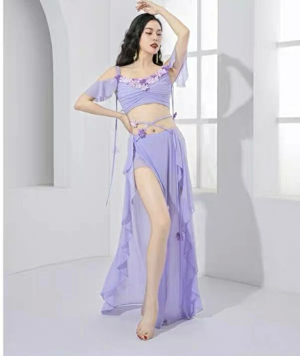 レッスンウエア 3Dフラワーデザインキャミトップス&スリットフリルスカート 2色展開 ベリーダンス衣装 コスチューム ステージ衣装 発表会 ドレス パーティー イベント オシャレ サーモンピンク ラベンダー パープル 紫
