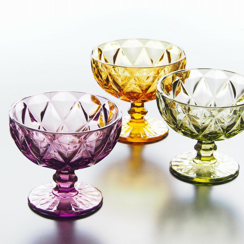 ガラス ダイヤ デザートカップ φ10.7cm 250cc 器 ガラス ガラスカップ アイスクリーム デザート デザートグラス 高台 高台グラス パープル 紫 グリーン 緑 イエロー 黄 ダイヤ レリーフ ガラス食器 ガラス製 涼しげ 清涼 おしゃれ