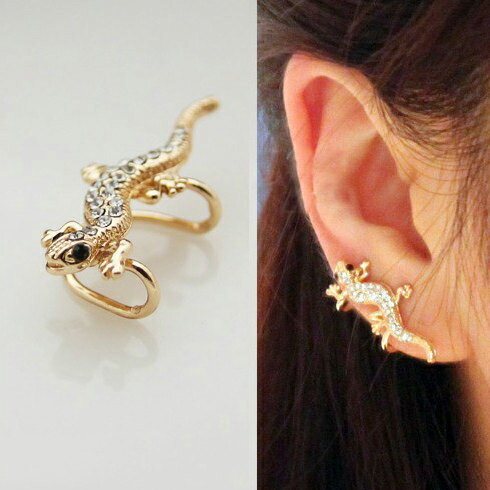 ダブルアールイヤーカフ ジュエルリザード トカゲ 蜥蜴 1個販売 イヤリング イヤークリップ フェイクピアス 耳 軟骨 メンズ レディース 穴あけ不要 挟む はさむ ゴールド クリスタル CZ ジルコニア ノンホールピアス パベ パヴェ キラキラ 人気 おしゃれ プレゼント ギフト