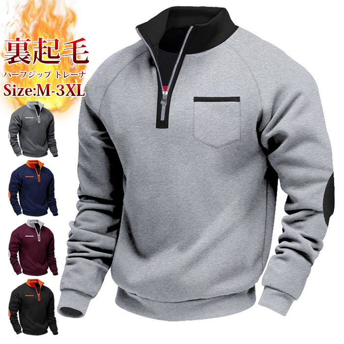 裏起毛 トレーナ メンズ スウェット 秋 冬 防寒 長袖 ハーフジップ 暖かい 保温 立ち襟 スタンドカラー 無地 トップス 大きいサイズ ゆったり 大人 おしゃれ カジュアル シンプル ファッション 秋物 春物 冬