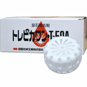 小便器にポンっと置くだけで尿石を除去、再付着を防止してくれます。 ケース付で、そのまま薬剤を置くより見た目が良くなります。 トレピカワンL(液体除去剤)で除去した後に置くとさらに効果的です。 ※こちらの商品は宅配便での発送となります。 ※商品画像は箱で載っております、実際の数量は内容量をご覧下さい。 【内容量】 50g×10錠 【トレピカワンシリーズの違い】 トレピカワンT-25(薬剤25g) トレピカワンT-25A(薬剤25gケース付) トレピカワンT-50(薬剤50g) トレピカワンT-50A(薬剤50gケース付) トレピカワンT-40Aライム(薬剤40gケース付ライム香料) トレピカワンL(液体1L) 【成分】 有機酸、ハロゲン化ヒダトイン、金属腐食防止剤 【特徴】 尿石除去効果:付着した尿石を溶解除去します。 除菌効果:除菌作用により、目に見えない配管も清潔に保ちます。 消臭効果:悪臭成分を分解除去するので、トイレ室内のいやな臭いがありません。 ※金属腐食防止剤を配合し、徐溶性のため、腐食性はほとんどありません。 【使用方法】 1:小便器の目皿の上に1〜2錠置いてください。 2:季節や使用水量により異なりますが、1〜3カ月効果があります。 【注意事項】 ◎使用の前には、同梱されている説明書をよくお読みください。 ◎尿石除去の用途以外には使用しないでください。 ◎子供の手の届くところには置かないでください。 ◎本剤に直接、酸性、アルカリ性の洗剤などをかけないでください。分解ガスが発生し、危険です。 ◎使用中に眼にしみたり、気分が悪くなった時は 使用を中止し、新鮮な空気の場所に移動し洗眼してください。 ◎本剤が直接、皮膚や衣類、カーペットに付着した場合は、水洗いしてください。 ◎本剤が金属類に付着した場合は払い落とすか、水洗いしてください。 ◎万一、口に入った時は牛乳や水を飲み、眼に入った場合は流水で洗い 速やかに医師の手当を受けてください。 ◎できるだけ乾燥した涼しい所に保存してください。