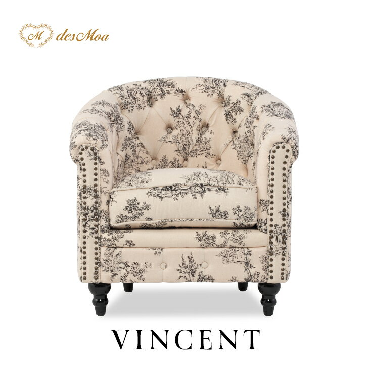輸入家具 チェスターフィールド ソファ 一人掛け デザイナーズ そふぁ ソファー ヴィンセント ソファ 1シーター 一人用 シングルソファ VINCENT イギリス 英国 ヴィンテージ レトロ アンティーク 店舗家具 布生地 ファブリック トワレ柄 VL1F84K