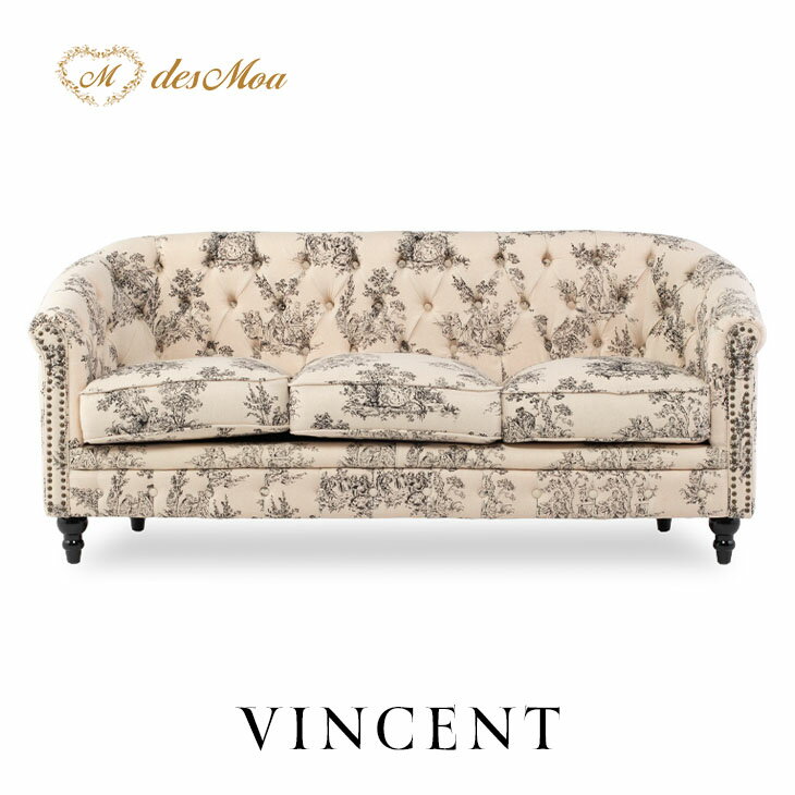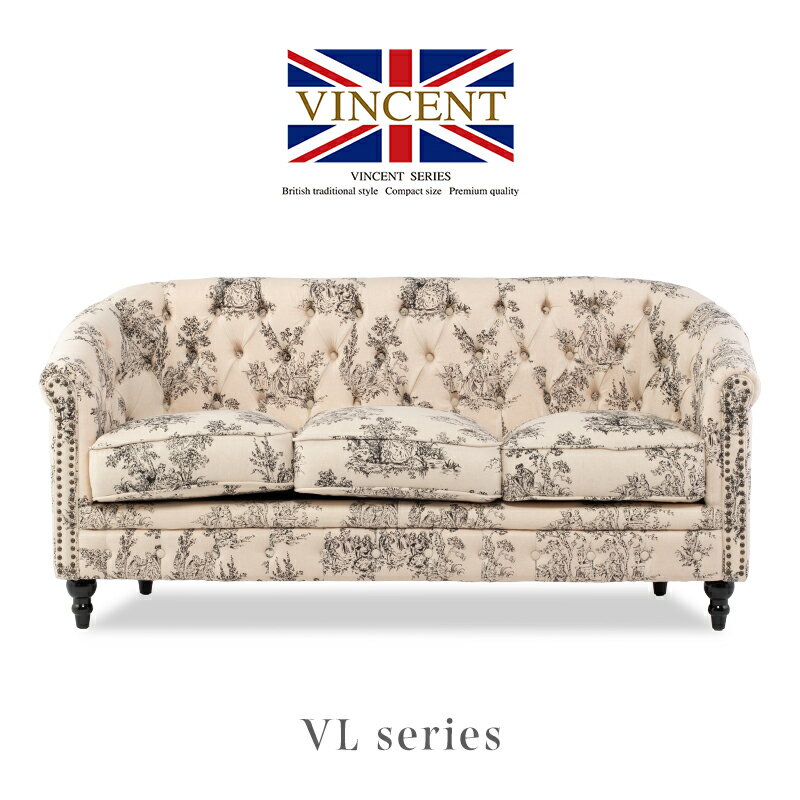 輸入家具 ソファー 3人掛け ヴィンセント コンパクト ソファ ホテル ソファー チェスターフィールド ソファ 三人掛け チェスターフィールドソファ 三人用 長椅子 ヴィンテージ ビンテージ レトロ アンティーク イギリス おしゃれ 布生地 ファブリック トワレ柄 VL3F84K