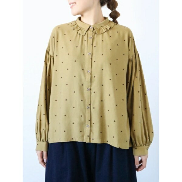 フリルカラーが可愛いドットブラウス!レディース トップス ブラウス ドット カジュアル ナチュラル 綿麻 コットンリネン 長袖 春 秋 冬 ロングシーズン 着回し 大人カジュアル フリルネック かっちりコーデ
