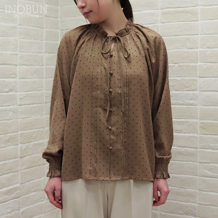 シャーリング織ドットフリルブラウス 大人が着やすい 上品 華やか ドット柄 トップス ブラウス 長袖 スタンドカラー 春 秋 ゆったり オケージョン 入学式 発表会 通勤 OL 綺麗め デート服 ぽわん袖 サマーセール