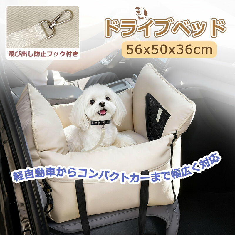 ■商品仕様 【商品名】:ドライブベッド 犬 猫 車 2way 【サイズ】:56*50*36cm 【カラー】:ベージュ 【素材】:フェイクレザー 【対象】:小型犬 【重さ】:約2kg ■商品紹介 【超厚クッションでふわふわ快適】 ふわふわで厚みのあるクッションが体を優しく包み込み、長時間ドライブでも安心。 【飛び出し防止リードフック付き】 ワンちゃん、ネコちゃんの急な飛び出しを防ぎ、安全にお出かけできます。 【助手席/後部座席どちらも簡単設置】 シートベルトで固定するだけの簡単装着。車種を問わず使いやすい設計。 【滑り止め+お手入れ簡単】 底面は滑り止め付きで安定感抜群。レザー素材だから汚れてもサッと拭くだけ。 【メッシュ窓で通気性抜群】 車内の空気をこもりにくくし、愛犬/愛猫の様子がいつでも確認でき安心。 【取っ手付きで2way仕様】 取っ手付きでそのままキャリーバッグとして持ち運び楽チン。病院、お散歩にも便利! ■注意事項 ※ご購入前にサイズをご確認ください。 ■客様がご利用のモニターの設定及び特性により、実際の商品とは色味が異なる場合がございます。 ■商品サイズは1~3cm程度の誤差が生じる場合がございます。あらかじめご了承くださいませ。●こちらもおすすめ ペット マット ソファ 猫犬兼用 洗える ペット ステップ ハウス