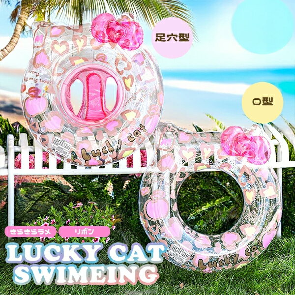 【最安値挑戦中】ラッキーキャット スイムリング 足穴 子供用 浮き輪 O型 取っ手 持ち手 ハンドル 付き 足入れ 浮輪 うきわ フローター 猫 キャット リボン ヒョウ柄 レパード 海 プール SNS映え ピンク クリア 水遊び 水慣れ お風呂 ラメ キッズ 夏 ネコポス便送料無料